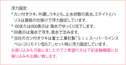 武蔵カン付きタイプ キャッチーカン付きタイプ 2段ウキカン付きセット 武蔵中通しタイプ キャッチー中通しタイプ 2段ウキ中通しセット ガン玉・オモリ重量表 通販・振込み口座について ホームページTOP ご注文フォームに進む前に必ず注文個数をご確認ください。ご希望数と異なる場合は個数を訂正後に修正再計算をタップして下さい。