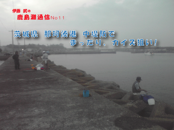 茨城県 那珂湊港 中堤防で午後からまったり、カイズ狙い。 8月2日、日曜日。午前中は仕事で、午前11時頃に家に戻りました。帰りに那珂川を見て帰り、上流の栃木県で前日雨が降ったのか、河口は良い感じに濁りが入っています。 家に戻り、釣りの支度をして通いなれた那珂川の河口に位置する、那珂湊港の中堤防に行くことにした。今日はさほど暑くはなく、釣りやすそうである。 釣り場の中堤防に到着し先端部まで一通り見て歩くと、表層にはボラの大群と足下から竿二本までは、ふぐと木っ端メジナが群れているのが確認できた。まだクロダイは(カイズ)上がっていないようだ。釣り座を先端部から30メートル手前に取り、14時30分頃釣りを開始した。水温は19.5℃である。今日は、オキアミ3キロにマルキューのダッシュ一袋、ムキパワー白を半袋合わせ、付けエサに食わせオキアミスペシャルチヌLをチョイスし、ウキはトーナメントSP-RのB、 Sサイズオレンジをせっとした。狙いは沖目のカケアガリで竿一本前後のタナである。 開始して数投は、もやもやとしたアタリが出るものの、なかなかハリがかりせず、やはり16時の満潮から下げ潮に入らないとダメかなと肩を撫で下ろす。ウキを沈めたり、トーナメントSPの0に変えスルスルで狙っても、表層だけ流れる二枚潮でなかなか仕掛けが入らない。ここでちょっといっぷくです。フィッシング大洗店のお客さんが竿を出していたので暫し談笑して戻ると潮が流れ始めたのか鏡潮が出始めています。時間は16時30分を回り下げ始めです。しかも、船道のカケアガリ付近に良い潮目が出ています。竿下にエサ取り用のコマセ入れ、遠投再開です。他の釣り人はフグばかりですが、コマセで上手く分離出来ているのか?フグが私のポイントには入って来ません。時折付けエサのオキアミも戻ってきます。ここは集中と、確りコマセを打ち分け仕掛けを遠投して、潮目を捉えて右から左に良い感じでウキが流れていきます。すると!『きた〜ッ!』と言う声に同時にビックリです。フィッシング大洗店のお客さん。私の左側に釣り座を移していたのです。慎重にゲットした30センチのカイズです。此で気合い入りまくりです。確りタナを取りたいのでトーナメ ントSP-R2Bにチェンジして数投目?。じわ〜っと愛用のトーナメントが沈んで行った。ちょっとラインを張り竿に来るまで待ち、『コッン!』。向こう合わせが決まり30センチ程のカイズです。一気に抜き上げ取り敢えずキープ。再度同じ感じで26センチ程のカイズが顔を出してくれました。 私の狙うポイントにはフグ等はおらず、確り付けエサがタナまで落ちるのか?ソゲ(ヒラメ)がその後二枚ヒット。確りコマセを撒いたせいか?コマセが無くなり、釣り座を流し竿を納めた。キープした魚は後ろで釣りをしていた。やはりフィッシング大洗店のお客さんの初老の夫婦に分けてあげ〜!喜んでいただきました。 ようやく、20℃の海流も入り出し、カイズ釣りのシーズンがやって来ました!。ここ那珂湊港では、カイズ混じりで荒天時や川濁りが入ると50センチオーバーも期待できるので一度竿を出してみてはいかがだろうか。 ヒットウキ トーナメントSP-R 0〜2B Sサイズ オレンジ エサ・問い合わせ フィッシング大洗店 рO29−269−8000 フィッシング鹿嶋店 рO299−90−7766 http://www2.ocn.ne.jp/~ooarai/ BACK |
