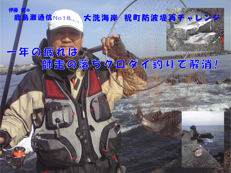 大洗海岸 祝町防波堤再チャレンジ。 23日の45センチの同型3連発の釣果を知り!?居てもたっても居られなくなった。『中村さん!。』聞くと、11月29日のマルキューMFGカップ千葉県富浦大会の後は、仕事が忙しく休みも無い状態でストレスたまりまくりの毎日だったのです。 『そんな状態では、ストレスもたまるよね〜?。』 『疲れてる時は、潮騒を聴いて?潮風にあたったら?。』 『そ〜だよな〜?。』『じゃ〜ッ!。明日!フィッシング大洗店に8:00と言うことで?。』 『サンキューソーマッチ。』 『中村さん!ゲット』です。 フィッシング大洗店で27日の8:00に待ち合わせ、大洗海岸の祝町防波堤へ・・・そこへ新規メンバーの黒澤君が合流。『宝山海』の佐藤君、栃木県から通っている高田君と次々に集まって来ます。釣り場に到着し準備に取りかかります。中村さんは、オキアミ3キロにマルキューのチヌ戦とチヌパワーV10白チヌを混ぜ合わせ、付けエサにマルキューの食わせオキアミスペシャルチヌLを用意した。ウキは『岡田ドングリPRO-R オレンジ5B』をセット。私は、オキアミ3キロをベースにチヌパワーダッシュ一袋にムギパワー白一袋を混ぜ合わせ、付けエサは中村さんと同じです。ウキはクリアーオレンジの3B〜5Bをローテーションします。最初は3Bでスタートです。 開始から約1時間は、後輩の指導をし『中村さん、我々も始めますか?』と第1投。中村さんが渋いアタリを取り、仕掛けを回収するとオキアミの頭が取られています。『伊藤さん〜?次喰っちゃうかも?。』仕事の疲れとストレスをこめた次投!。シモリ際を流れ、じわりじわり引き込まれていきます。『バッヒュ〜!。』やり取り開始です。クロダイは、竿を絞るだけで浮いてきません。『デカイかも?。』『マジ!デカイよ?。』起伏の激しい所からは、難とか出しましたが依然!一進一退です。クロダイが一瞬頭を向けた?勝負です。PROが確認できる所まで浮いてきた!。『が・ん・ば.....』『あ″.....。』『.......″。』私は一部始終見てましたがあれはデカイかもです。 さて気を取り直して再開です。 自分のポイントに戻り、沖のシモリを狙い振り込みます。マキエと同調していきます。シモリ際で『アタリ!。』ハエネをかわし取り込んだのは44.5センチのクロダイです。『中村さん?ごめんなさい?』『いいっす!。』『直ぐ釣るっす!。』するとと隣で黒澤君の竿が曲がり良型のクロソイがヒット。続いて中村さんに本命のクロダイヒット!。先程超大型を逃がしているだけに慎重に取り込んだのは42センチのクロダイです。『やっと来た甲斐があったよ!。』と中村さん。でも直ぐに釣り返す所はさすがです。これを期に午後から前線の通過で風、波共に強くなり、下げ始めに中村さんが35センチのアイナメを追加。クロダイの気配はプンプン?。釣れると危険は隣り合わせです。後ろ髪を引かれる思いで釣り場を後にした。最後に極翔クロダイのバッドポテンシャルを考えると、正に夢の一枚だったに違いない?。中村さん!仕事は29日迄だとか?これで少しは、ストレス解消?仕事の疲れは癒せましたか?。 30日は、ウキ工房茨城支部の納会ですよ!。 一年ご苦労様でした。 |