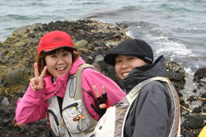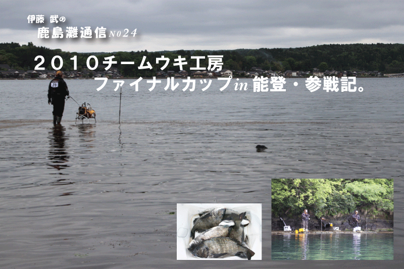 in 能登』 参戦記。 5月29日〜30日の二日間、ウキ工房の最大のイベントの一つ『チームウキ工房 ファイナルカップ in 能登』に参戦して参りました。第一回の佐渡に始まり、庄内に次ぐ第三回大会です。三年に一度開催される!いわゆるウキ工房のワールドカップ?なのであります。(日本代表の監督も岡チャンでしたね(笑))....。一路茨城を出発、栃木県、群馬県、長野県、新潟県、そして富山県と600キロ以上....!。五県を走破やって参りました!『能登半島』・・・ 待ち合わせ場所に到着したのがAM4時を回ったあたりだろうか?....。薄暗い中にも懐かしい顔ぶれや新しい顔ぶれも・・・皆さん長距離運転で疲れていないのか心配になっちゃいますね。でも気合いが入っているのは確か。各支部が集まり、いよいよ!岡田さんの挨拶でファイナルカップのスタート?・・・のはずだったのですが。ここで、岡田さんが能登半島に来たもう一つの理由を暴露...。『倉ちゃんこと長野支部で副本部長の倉石さんに...「何でこの間、テレサ・テンの歌を聴いて号泣していたの?」この真意を聞きたかったとのこと。でも本人(倉ちゃん)不在で不発....。朝の挨拶もすみ、号泣の謎は夜の懇親会へ持ち越しとなった。岡田さんの挨拶で気合いを注入〜! 個人戦、団体戦に別れて各釣り場に向かった。私達、茨城支部は支部長の橋本くん、真弓さん、私で個人戦に出場。団体戦には、黒須さん、清水くん、黒澤くんが向かい、私達は穴水の野々木鼻へ移動。前に『645』の何やら不審ナンバーの車が?・・・佐渡の近藤さんである。渡船場に付き、近藤さんに貴重なアドバイスを頂いた。『ここは、クルブシからヒザまで潮が上がるのでブーツが鉄則だよ?』と言い、参加者全員がブーツを履くなか、近藤さんだけシューズ....?。筋金入りである。そして磯割りの抽選。私は20番で19番は岡田さんである。橋本くん、真弓さんは22番、23番で野々木鼻の先端に渡る事になり、磯に無事上がり、岡田さんから野々木鼻のポイントや攻め方を伝授して頂き各自準備完了、AM6時に一斉に競技開始。私はワンドを挟み岡田さんの対岸に釣り座を取った。しばらくして待望のアタリ...。小気味良い引きで能登第1号は手のひらサイズのカイズだ。岡田さんもそのサイズに手を妬いている模様。すると岡田さんに良型がついにヒット!・・・5m程張り出したハエ根をかわし取り込み体勢のはずだったが『ありゃ〜!伊藤く〜んやっちゃったよ...。』と一言。でも潮が動かない中、良型を掛けるとは恐れ入りました。その後やはりカイズクラスは上がるもののサイズアップせず時間だけが過ぎて言った。野々木鼻の湾奥の奥からは、朝から近藤さんの声が響き渡り、あい変わらず近藤さんは全快バリバリ・・・! 午後1時をまわり風が強く吹き出した。すると潮が動きだし時合いが到来。岡田さんが足下を60cm近い巨チヌが泳いでいるのを目撃....。『伊藤くんの方にデカイの泳いで行ったぞ』と言われ、『ヨシ!巨チヌ来いよ〜!』と念じていたら行きなりチヌキラーが海中に飛んでいった!・・デカイ!・・・しかし、巨チヌではなくメーター級のピンクのカンダイで1.25号のハリスはもとよりチヌキラーも持って行かれてしまった。『まずい?』と思い岡田さんを見ると『またまた!やっちゃったよ2連発だよ...。』岡田さんのまさかのバラシ2連発でほっと肩を撫で下ろす。橋本くん、真弓さんもヒットパターンを掴み沖目を攻めている。ここで岡田さんが「伊藤くんもこっちに来なよ〜」と天の声。すかさず隣に入れていただいた。そこで、岡田さんの撒きエサを見ると淡いピンクの配合を使っているではないか!。 『岡田さん、その配合は?』と聞いてみた。『クロダイの配合が無くて...グレの持ってきたんだよ。クロダイもバンバン釣れるんだね....?』と言っていた。グレ用の配合が岡田さんの手により『Gスペシャル・チヌ能登バージョン』に変化していたのだった。初日の競技時間が残りわずかとなった14時頃!・・・『いい感じだ。食えばデカイぞ...。』誘いを丹念に入れる岡田さん。そして『ほれ..!ほれ..!ほれ..!これでもか誘いをと掛ける岡田さん・・・。それをじっと見る私!・・・。 『ほ〜ら!食ったよ!・・・そっち行っちゃ駄目ぇ〜....。』バッドから曲がる竿!。 『デカイから!時間をかけるよ!』歳で肩が上がらないはずだがリハビリ釣行を重ねているためかあるいは執念か、竿の取り回しも速く余裕のやり取りで大チヌの動きを操っている!・・・とんでもない親父である。イナシも入り完全に岡田さんに操られているクロダイも可哀想だ。そして確認出きるところまで浮いてきた。 『デッ?デッ!デカ〜ッ!。』 『伊藤く〜ん、写真撮って!。』余裕である。数回の引き込みはあったが難なく取り込み完了。撮影を済ませ計測すると55cm近いクロダイで『やっと3発目に取れたよ。全部捕ったら皆に悪いからな.....。』ごもっともです。(笑) これで、岡田さんは終了。バッカンを洗い、洗い汁を私の足元