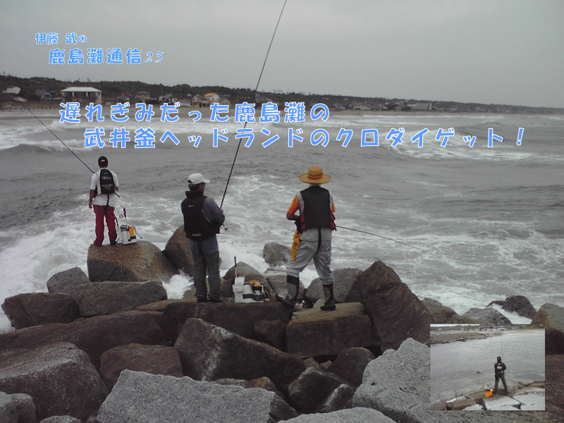 『茨城県 鹿嶋市 武井釜ヘッドランド』 梅雨入り間近の関東地方。この記事を書いている最中にも梅雨入りしそうだが、梅雨入りも今年は遅れているようで、あいかわらず気圧の谷間に入り茨城県沿岸はシケ模様です。遅れ気味だった鹿島灘のヘッドランドもまとまった釣果が聞かれるようになり、6月13日(日曜日)に今季はじめて鹿島灘にある武井釜ヘッドランドにクロダイ狙いで出かけて来ました。当日は大潮と重なり速い下げ潮が予想され、おりからのシケで波も高そうだ。目覚まし時計の音で目を覚まし慌てて部屋を出た!『ガタガタ?ドカン!。ボキッ!グチャ...!。』出かける前に自宅の階段で足を踏み外し足首を捻挫...!なんとか歩けるので早朝の3時30分待ち合わせ場所に向け、自宅を釣り場に向けて出発しました。途中、同じクラブの黒須さんと待ち合わせ場所で合流して、鹿嶋市にある武井釜ヘッドランドに向かった。釣り場に着くとやはり波もウネリも高く4m位ありそうです。素早く準備を済ませヘッドランドの内側に釣り座を確保してタックルの準備開始です。当日は波も高く流れも速いのでさばきの良さと視認性の良いサスペンドBYスペシャルの1.75号と砂濁りに同化する、ステルスブラウンのフロロファイタールーツ1.25号をセット、ウキはウキ工房のクリヤー凸の5Bにハリは金龍針の勝負グレの7号をチョイス、まきエサにマルキューのチヌパワーダッシュとチヌパワーMPを各一袋をオキアミ3kgにブレンド、付けエサにスーパーハードBig-Lを用意した。開始して暫くはエサ取りに付けエサは取られるもののハリがかりせず時間だけが過ぎていった。その後、隣の福島県を震源に強い地震が有ったと!釣友から連絡があった。震度5だそうだ。取り敢えず津波は大丈夫そうなので再開です。砂濁りが入りイシモチは入れ食いになっているがイシモチを釣らないように離岸流の中を丁寧に流します。するとソコリ近くに良く釣れるアイナメがヒットするようになり下げ止まりも近そうだ。そこに同じクラブの佐藤くんが合流!『良い潮がきてんじゃん!上げ始めたら食っちゃうよ!』と釣りを開始。離岸流の中をラインコントロールをしながら、ストラクチャー周りを巧みに攻め!予告通り上げに入り、サクッと40cmのクロダイを釣り上げた。『良い仕事してますな...。お見事です。』その後、佐藤くんが黒須さんにそのポイントに入るようにすすめ黒須さんも頑張っています。私は早朝に足首を捻挫してしいまい痛みに耐えながら釣りを......しています。クロダイが釣れれば痛みも忘れるんでしょうが?(笑)そうはいきません。食いが今一つなのでフロロファイタールーツ1号にハリスを替えて狙う事にし、そろそろ痛みも限界に達した?13時頃。遠投したクリヤー凸を離岸流の川の流れに乗せ渓流釣りの要領で竿先でアタリを取りながら流していると!『ガッン〜!。』一気に引き込むアタリです。『あ〜ッ!。食っちゃったかも?』すると捻挫をしているのを知るかのごとくハエ根のキツイ方へと一直線!。『うわ〜ッ!(痛)グン!グン!(痛)』BYスペシャルの視認性は良くクロダイの動きは手にとるように解るのだが?何せ釣り人がヘナチョコです。巻いては『グハ〜ッ(痛)。』竿を立てれば『ズキ〜ン!(痛)。』なんとかウキが浮いてきた!。ルーツの強さを信じ!一気に浮かせた!。『ボカッ!。』45cmクラスの良型です。タモ入れも一発で決まり。なんとか取り込み完了。計測すると45cmのパンパンのクロダイであった。この一枚をとり、もう限界と竿をおさめた。足首を見ると倍以上に腫れてしまい。急いでかかりつけの接骨院に駆け込んだのは言うまでもありません。鹿島灘のヘッドランドは今正に最盛期、シケは多いが梅雨ナギに期待したいところです。 皆さんも是非挑戦してみてはいかが? 伊藤 武 |