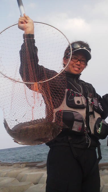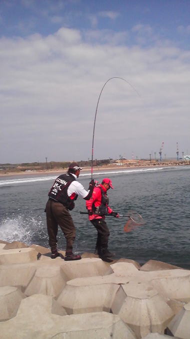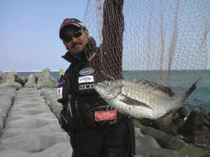 『茨城県 阿字ヶ浦海岸・鹿島灘 ヘッドランド。 東日本大震災での励ましやお見舞いありがとうございます。私も釣り始めました!。』 震災から全く釣りをしていなかった私も、49日を過ぎ心にも一区切りついた4月29日の(昭和の日)ゴールデンウィーク初日に地元の阿字ヶ浦海岸で竿を出すことにした。 考えてみると?2月の下旬から実に2ヶ月ぶりで、こんなに竿を出さなかったのは記憶に無いほどだ。 震災から多くのメンバー、釣友から励ましやお見舞いの言葉を頂きました。『本当にありがとうございました!。』この場を借りてお礼申し上げます。 茨城県の海岸線は、まだまだ震災(津波)の爪跡は残っている状態です。でも影響の少ない釣り場には、多くの釣り人が戻りつつあり!クロダイの釣果も聞かれます。 そんな中私の自宅から約5分程の所にある。『阿字ヶ浦海岸』に出掛けました。29日の朝、黒澤くんこと黒ちゃんと待ち合わせ阿字ヶ浦海岸へ。9時頃に到着し、割りと空いている阿字ヶ浦の3番堤防に入ることにした。釣り座は、堤防の中程に構え上げ潮、下げ潮共に効率的に攻められるポイントを確保した。撒き餌さは、マルキューのチヌパワームギ1袋にV9遠投を1袋をオキアミ3キロに混ぜ合わせ、付けエサにスーパーハードBig-Lをチョイスした。海の状況を良く観察すると?ウネリが入り、上潮は効いているが下潮は動いていないようだ。ウキはクリアー凸の4Bオレンジをセットし、確り撒き餌さを撒いて『第1投...。』ウネリが入るタイミングで誘いを入れると?ウネリと同時に手前に戻されてしまう...。底潮も弱く?効いてないよ!と波まかせでラインを打ち返すと?10メートル程潮下に戻ったであろうか?。逆波のミヨ筋に仕掛けが上手く入り!押さえるアタリ!。引き込むアタリは出なかったが、間違いなくクロダイのアタリである。1投目からアタリとは...。『クロダイも震災に耐え?私を待って居てくれた?。』とても嬉しい第1投である。第2投は、そのままエサが帰ってきた。そして第3投目...。タナを1ヒロ上げ!2ヒロにし遠投してミヨ筋を沖から引き釣りをし、足下に撒き餌さを撒き潮の効いているポイントで合わせると...。クリアー凸が『ス〜?。』じっくりと仕掛けを送り込み!『バシ〜ッ!』同時にクロダイ特有の引きが!。『グン!グン!グン!』クロダイの引きは堪らない!。十分に引きを楽しみ取り込んだのは!40センチとまずまずのクロダイである。そして1時間程経った頃に?沖目でヒット!。これは、先ほどのクロダイより引きが強い!。これもじっくり引きを楽しみ取り込んだのは?先程よりアン(兄)ちゃんのクロダイで43センチ。これで私は、黒ちゃんのサポートにまわることにしました。私の釣りのイメージをアドバイスしながら仕掛けを振り込むこと2時間?...。黒ちゃんに待望のアタリ!。確り竿に乗せ沖からクロダイを引き寄せます。『ギラリ...。』『黒ちゃん!良型だっぺよ!。』慎重に私が差し出すタマにキャッチ!。これも43センチです。聞くと?去年の秋前からスランプで、久々だとか?。『43センチやったね! 黒ちゃん!。』このクロダイが上がりチヌになり釣り場を後にした。当日の釣果は、カイズが他で1枚釣れたのみで私と黒ちゃんのクロダイ3枚と言う釣り始めにしては言うことの無い震災後の出だしとなった。 明けて5月5日のゴールデンウィーク最終日(こどもの日)。朝からナライが吹き生憎のシケ模様です...。午後からの上げ潮狙いで!釣り場を見て回り鹿島港のラジオポートや鹿島灘のヘッドランドを見て回った。やはり震災と津波の影響は甚大です。浜には船舶やコンテナ、漁具等が打ち上げられていますが大分片付けられてきています。道路も隆起して走りにくい所は有りますが大分復旧してきています。此からが鹿島灘ヘッドランドの最盛期に突入していく事を考えると、入釣経路が確保出来ていることは、非情に有り難く!作業にあたってくれた方々に本当に有り頭が下がります。鹿島の釣り場を一通り見て回り途中で同じ茨城支部で金龍ばりスペシャルスタッフの中村さんも合流、弁当を購入して中村さんのすすめで小山ヘッドランドに入釣することにした。 沖側は、波が高く釣りを断念しヘッドランドの回り込んだ堤防の内側で開始した。激しい離岸流がかすめている...。ウキは!自重があり操作性の良いメタXの5B、ピンクをセットしてオキアミ3キロにチヌパワームギ1袋、チヌパワーV9遠投を加えまとまりを考え良く練り込んで使用。中村さんと並んで竿を出すのも久し振りです。ややあって、アタリも遠いので遅めのランチタイム...。釣りをしながらの弁当は、何でこんなに美味しいのか?あっという間に平らげ?釣りを再開した。すると潮が上げ離岸流も緩やかに...。これは行けるかも?と言うより早く中村さんが、アタリを取り始めだした。『居るよ!居るよ!』と中村さん。私も丁寧にラインを操作し仕掛けをコントロールします。アタリがあるにもかかわらず、空合わせが続きます...。離岸流が速くクロ