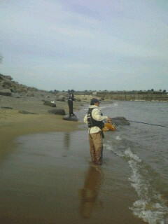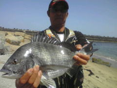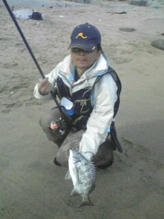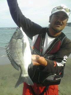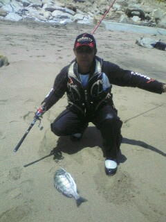 | 『茨城県 北茨城市 九ノ崎海岸の渚釣り』 マルキュー(株)より5月10日に新発売された!『Bチヌ遠投』の試釣を兼ねて、5月13日(日曜日)にウキ工房福島支部の渡部洋支部長と副支部長の佐藤正司くん(せいじ!じゃないよ?まさしだよ!)と私の3人で北茨城市の九ノ崎海岸に渚釣りに出掛けて来ました。渡部くん佐藤くん共に渚釣りは、初挑戦で凄く興味津々!。 Bチヌ遠投の開発と共にウキ工房から新発売された『渚チヌ』も同時に試してみたいとやる気満々です。朝マックをすませ!(柄の悪いオヤジが朝からコーヒー一杯で営業妨害)九ノ崎海岸に到着し素早く渚釣りの準備をすませ釣り場に移動しました。 釣り場の浜に着くと仕事で寝ていない佐藤くんは、赤ら顔で徐々にテンションが上がって来ています?...。渡部くんは、マジで釣れるのか?半信半疑の様子です。そしてBチヌ遠投の説明と私が使ってみての感じや岡田さんから開発当時に私も受けたアドバイス、それに合った仕掛けタックルの説明を伝え撒きエサ作りに取りかかった...。渡部くんはBチヌ遠投一袋にムギパワー白1/2袋をブレンドしオキアミ3キロと海水2で仕上げ!佐藤くんはBチヌ遠投一袋に良く解かしたアミエビ4キロとオキアミ3キロを混ぜ合わせ!海水無しで仕上げ、二人共に手捏ねで満遍なく混ぜ上げました。(佐藤くんの手臭いョ!...。やる気のあられだそうです...By渡部、佐藤)。同時に水温を計ると15.5℃有り茨城周辺も水温が上がって来ており期待が高まります。付けエサはマルキューの食わせオキアミ スーパーハードBIG L と食わせオキアミスペシャル チヌ Lをチョイスし、渡部くんは、スナイパーのMサイズに佐藤くんは渚チヌの大をセットし今や渚釣りの儀式になりつつある...?ポイントを作る為のお団子爆弾!?洋玉!武玉!正司玉を各自投入!渚釣りを開始した...。釣り開始は、無風に近くお昼過ぎには正面の南風に変わり釣りづらくなってきました。そこで各自ウキをチェンジしデルタ1やチヌキラーに変更し撒きエサのBチヌ遠投を調整し直し午後の上げ潮の時合いに備えた。すると立ち藻の生えたポイントを攻めていた佐藤くんが!『伊藤〜さん!』と呼ぶので振り返ると!...。砂浜から岩の上に乗り渚のシンドバッドを踊っているって言うか?やり取りの真っ最中です。 『渚釣りだから?その岩から下りろ』と!言うと『やだ〜ッ!』と大分気にいったらしく下りないので、私と渡部くんでその岩を『正司岩』と命名してやりました。すると又しても正司岩に乗り『伊藤〜さん!』とテンション上がりまくりの佐藤くん!。同サイズを追釣し寝不足の頭は最高潮!意味の解らない言葉を連発し?『渚ちゃん!...。Bチクスゲ〜ッ!』と完全に頭はBチク遠投に洗脳された様子です。(Bチヌです!By花岡マルキューの方)...。すると浅場を根気強く攻めていた渡部くんにアタリがあり!。砂浜から正司岩に上がってやり取りし41センチを釣り上げました!。すると『浅場で掛けるので良く走る!』と興奮した様子です。またBチヌ遠投を入れながら観察すると、クロダイのハネが出たり!波内際にクロダイが入って来たり撒きエサにボイルしたりと凄いことになってきました!。圧巻は、渡部くんの入れた仕掛けをクロダイが尾びれでウキごと弾き飛ばしたことです!。また見知らぬ大型の魚が波打ち際まで入って来たりと3人で目撃し大興奮でした。 そして夕マズメに入り佐藤くん!渡部くん共に大型のクロダイが掛かりましたが?ハリ外れやハリス切れで取り逃がしてしまいました。また、満潮に入ると正司岩は水没し寂し気な佐藤くん...。仕掛けがやり取り中に立ち藻にかかるようになると正司岩に上がってやり取りしないと立ち藻を交わしづらい事が判明!。正司岩は(何の代わりばえのない砂浜から出た小さなオンコ色の岩)、九ノ崎海岸の一級ポイントたったのだ...。恐るべし正司岩。そして、周辺が暗くなり始めた為道具を片付け浜を掃除して二人の渚釣りデビューは幕を下ろしたのであります。当日は私が3枚に佐藤くんが2枚、渡部くんが1枚でクロダイを8掛け!6枚キープし2バラシと言う釣果でしたが、Bチヌ遠投と渚チヌの凄さと新しい釣りの渚釣りを改めて認識し有意義な釣行となりました。茨城県は渚が多くクロダイの魚影が濃いのでまだまだ未知数です。是非ともクロダイの渚釣りに挑戦してはいかがだろうか。 BACK |