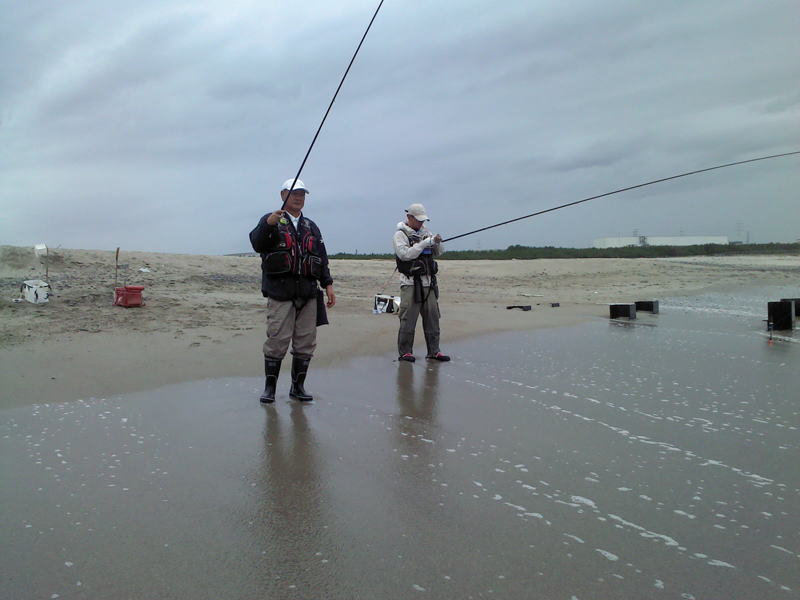 !を迎え開催されるなど!私の地元ではまだ少数だがウキふかせ釣りの延長で狙えるため密かなブームになっている。 渚釣りの試し釣りと釣り場の開拓を兼ねて10月21日(日曜日)と28日(日曜日)の両日、私の自宅からすぐの東海村村松海岸に出かけてまいりました。 21日は(鹿島灘通信投稿)ウキ工房いわき支部の佐藤くん、賀沢くんが同行し、48cmで佐藤くんの自己タイ記録。渚釣り本格的に挑戦する賀沢くんもその後続けてヒット。47.5cmの大型クロダイを釣り上げ賀沢くんも自己記録更となった。私も43cmを頭に良型を三枚釣ることができた。そして明けて翌週28日。21日にまきエサが入った事や沖にクロダイのハネを数回目撃した私は、50cmオーバーは間違いなく釣れると確信し!ウキ工房茨城支部で金龍ばりスペシャルスタッフの中村さん、いわき支部長の渡部くんと再チャレンジする事となった。この日は朝6時に集合し干満の潮時を両潮共に朝夕マズメに狙うことができる良い潮回りです。 浜に出ると前線の通過で波が高い状況ですがこの位の波だったらなんとかなると準備に取りかかった。まきエサはマルキューのBチヌ遠投と活サナギミンチ激荒を各1袋にオキアミ3kgをあわせ波対策としてまとまりのある配合を更に練り込み波に負けないイメージで仕上げ付けエサには波に揉まれてもハリからずれないハード加工のくわせオキアミスーパーハードチヌとくわせオキアミスーパーハードLを用意した。ラインは視認に優れたゴーセンのBY スペシャル2号ウキはウキ工房のスナイパー4Bでスタート! ハリスは這わせて狙うためゴーセンのフロロファイターJUDE1.75号をチョイスし這わせて完全に飲み込ます作戦なので金龍ばりの勝負チヌSS4号を結んだ。開始から2時間は当て潮と波がきつく仕掛けが入るポイントを探すのに費やしてしまった。依然当て潮はキツいままだ!。 中村さん、渡部くんも黙々と手返している、負けてはいられない。まきエサも柄杓で撒きつつ野球ボール位のだんごにして定期的に投入し、しっかりポイントを作った。すると白波のなかでコツコツと前アタリが?。するとラインが引き波と同時に走り!本日第一号のクロダイが顔を見せてくれた。30cmだが悪条件下の価値ある一枚だ。アタリがあり一枚釣れると気合いが違うもの?手返しにも力が入る。仕掛けを遠投し、当て潮に合わせながら引き釣ります。 愛用のシブシブに調整したデルタ-1がヨブに入り引き波で沈んでいった。そこで竿先に仕掛けの重さをかけながら誘うとまたしてもコッ?。アタリと確信し本アタリを待った。ラインが張ったまま動かない?完全にハリを飲んでいると思いアワセを入れた。3mの波ウネリをものともせず波を4波乗り切って沖に50m程走って止まった。大型間違いなし。波を見ながら慎重に寄せにかかる!クロダイの引きに波の抵抗が重なり何時もの2倍いや3倍増しで海に帰ろうと抵抗します。竿もバッドからグニャリと曲がり大型クロダイの引きと波の抵抗で悲鳴をあげます。もみ返す波が高く、ヨブをかわすことが出来ない 。浮かしては波に入る大型クロダイ!・・・波を使いなんとかズリ上げた!。 50cmは有りそうだがやたら太い(2.65kgの雄)クロダイです。早速メジャーに這わせ計測すると50.3cmと納得サイズを上げることができた。そしてポイントを中村さん、渡部くんに譲り私はサポートとカメラマンにまわり、直ぐに中村さんが一枚釣り上げた。すると中村さんが渡部くんのサポートに回ってくれ荒波攻略法をアドバイスし、ここから渡部くんの一人舞台です。潮も下げに入り右から左沖に流れると42cmを頭に3枚良型を連続ヒットさせ最高潮・・・顔をクチャクチャにして喜んでいた。そして日没と共に納竿となった。片付けの最中には、あんな波の中でもクロダイはすぐ近くの白波まで来るんですね!サイズのわりに良く引くなど感想をのべていた。2週に渡り村松海岸を攻めましたがいずれも大型クロダイを上げ参加メンバーが全員クロダイを上げました。茨城でも渚釣りのポテンシャルは未知数ではかりしれません?皆さんも渚釣りに挑戦してはいかがだろうか。 BACK |