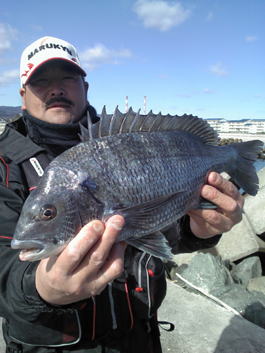 | 『2013年度茨城県クロダイシーン開幕』 新年を迎え!良いスタートをきった?クロダイ釣り師も多いはずです。 今年の爆釣とご健釣を心より祈念いたします。 2013年最初の鹿島灘通信は、1月27日(日曜日)に茨城県高萩市にて福島支部長渡部くん茨城支部のベテラン白井さんを迎えて茨城県の北部高萩海岸の寒クロダイにチャレンジして参りました。 日の出と共に集合し寒さに耐えながら準備開始。オキアミ3sにマルキューのチヌパワーV10白チヌを1袋に白チヌスペシャルを1袋混ぜ合わせ、付けエサはくわせオキアミスーパーハードBig−LとくわせオキアミスーパーハードLを用意し開始しました。 わたしはアルファエンスイの4Bをセットし渡部くんはチヌキラーS 3B、白井さんはおかだどんぐりPRO-R5Bを使用します。先ずは白井さんがアタリを取りやり取り開始。竿の曲からナイスサイズ間違いなし!余裕で取り込みました。 『全然引かなかった?ただ重いだけ!』と流石!白井さん。49.5cmの大型クロダイでした。 そして今度は私にヒット!。元気なクロダイで寒クロダイの引きを楽しませてくれたました。ストラクチャーを交わし取り込んだクロダイは46cmと納得サイズです。そして離れて竿を出していた渡部くん!・・・白井さんの一番のお勧めポイントで48cmと46cmを釣り上げて顔をくちゃくちゃにして喜んでいました。 その後48cm42cmを追釣し全部で大型クロダイの数釣りを楽しんだ一日となりました。 今年も楽しい釣りをしたいと思っています。茨城クロダイと鹿島灘通信を宜しくです。 BACK |