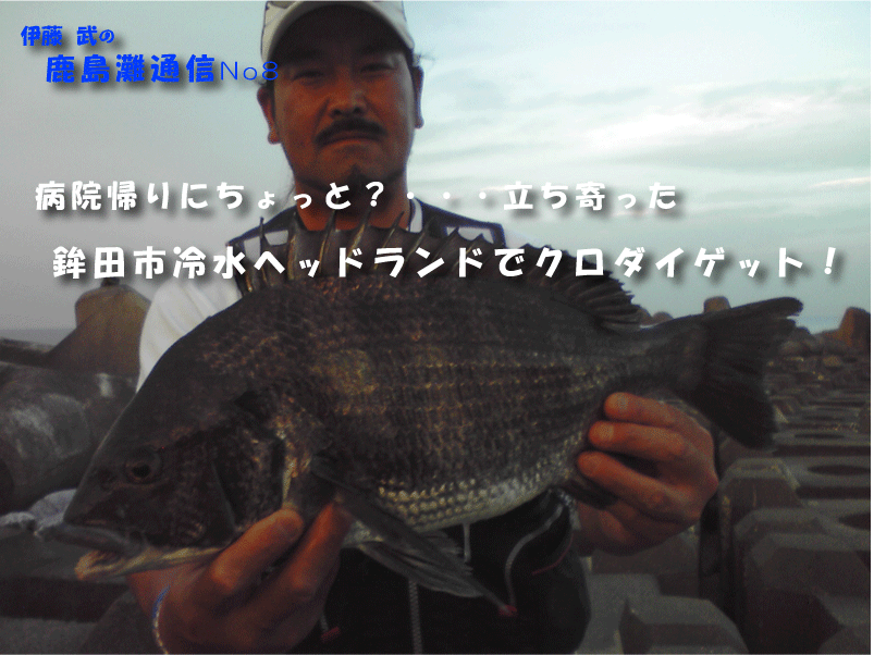 | 茨城県鉾田市 冷水ヘッドランド。 7月13日の月曜日です。今日は、午前中に病院に行き午後からの釣りになります。潮は大潮明けの中潮で水温は、釣友の情報より17.6℃と昨日に比べ0.5℃上がっています。 これも、上げ潮の利いた午後の潮だからです。やはり下げ潮の時は水温は下がるようです。治療が終わりフィッシング大洗店にオキアミの解凍をお願いして夕マズメの一発狙いで冷水ヘッドランドに行ってきました。フィッシング大洗店に到着して、急速解凍して頂いたオキアミを受け取り、副店長の渡辺君と最近の情報を話し、急いで釣り場を目指した。この日のコマセは、オキアミ3KGにマルキューのチヌパワーV10白チヌスペシャル、一袋に付けエサにくわせオキアミスペシャルチヌのLをチョイスして、夕マズメ狙いにかけます。白チヌSPの捕食効果に集魚、即効性に全てを託します。時間は、16時15分。ナギで底までまる見えです。先ずは、テトラと御影石との境に狙いを定め北側に釣り座をとり開始しました。ウキは少しでも潮を捉えるため下ブクレのクリアー凸、G3オレンジをチョイスして渋々と言う感じでスタート。水温が低いのかオキアミが返って来ます。そこで、ウキ止めを竿一本半にセット!タナ限定のスルスル釣りです。ウキ止めまで送り、誘いをかけて竿をゆっくり起こすと?じわじわウキが沈み、合わせを入れるとガッン・・・上がって来たのは、拳大の鹿島灘名物のハマグリです。これには私もびっくりしましたが同じ感じで、もう一つ追加し私も初めての経験です。ハマグリの連続ヒットに気分は最高なのですがナギで底までまる見えなので、少しでも潮が利く先端部へ移動した。 再開して暫くすると、コマセに反応してか?基礎石の陰からクロダイらしき魚が見え隠れしているのがわかり、狙いを1ヒロ半の固定にして、基礎石周りを狙います。ウネリが入るタイミングを見て、コマセと仕掛けを投入!・・・アタリは出るもののなかなか乗りません。半ば諦めていると、ス〜ッと?海藻に引っ掛かったように、ウキが引き込まれ、35センチのクロダイがヒットしました。水温が安定しないのと澄み切っているので基礎石の溝の奥に居たようです。だいたいのパターンが解れば、釣れない頭も回転を始めます。エサ取りのフグ用に沖にまとまったコマセを入れ、クロダイ用に基礎石の際とテトラの中にパラパラとコマセを入れクロダイを基礎石の溝の中から誘き出すイメージで狙います。時間も18時30分を過ぎ、陽が傾き影が伸び始め、今にも基礎石の溝からクロダイが飛び出して来そうです。そこで、確実にタナをキープするため、クリヤー凸のBにウキをかえ、溝の中に直接仕掛けを投入した。すると10センチ程ウキを押さえるアタリ!・・・じっくりウキが沈むまで送り凸が見え無くなった所で、アワせを入れた!。グググ〜ン!。竿先からクロダイの頭を振る感触が伝わった。頭を振る感触から間違いなく大型です。竿をあおり溝から出しにかかるが?なかなか出てこない!。再度追いアワセを入れ!竿を沖に向かってあおり、強引に引き出しにかかったら!やっとクロダイが走りだし、沈み根をかわし沖でやり取り開始。クロダイの動きを見ながら徐々に弱らせ、沖に浮かせたクロダイは間違いなく50センチオーバーです。タマ入れするまで、十分沖で空気を吸わせ!差し出すタマに一発で入り。見事年無しゲット!。居合わせたルアーマンにお願いして写真を撮って貰い。サイズを計ったら52センチの立派な鹿島灘のクロダイです。正に夕マズメ狙いの一発で狙って取った納得のクロダイとなった。 このクロダイをキープして辺りが暗くなり、帰りには山道を歩くのでお化けが出そうなのでいそいそと釣り場を後にした。 ベタナギ、澄み潮の場合はやはり、視角になる障害物周りや溝狙いになりますね。 ヒット ウキ。 クリヤー凸 G3〜B オレンジ |