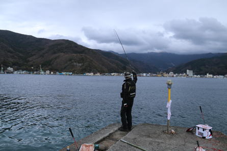 | 終了間際、岡田さんはクロダイを狙って一発で掛けた!! | いつもは綺麗な富士山が拝めるのだが残念ながらこの日は曇り空 |