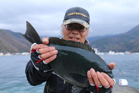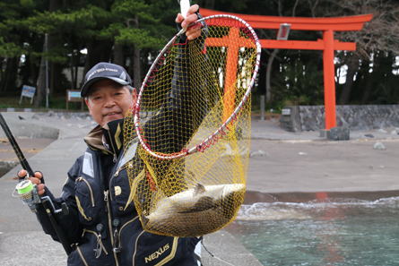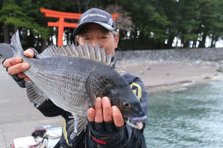 メジナもノッコミ期に入ったと思われ、岡田進さんと昨年この時期に、西伊豆・井田でメジナの爆釣を経験したので、「あの夢をもう一度」と思い、前日船長にTELを入れ予約。 3月19日(月)岡田さんと共に到着すると南西の風が強く波もあり渡船不可能。このような事は3回目で、普段の行いが余程・・・(笑い)。そこで、前回、前々回は石廊崎まで移動したが1時間30分以上の移動はうんざり!・・・そこで、風の影響も少ない「戸田・御浜岬の堤防」に移動した。 ここは御浜岬の先端近くで戸田港に面し「諸口神社」の赤鳥居の前に30m程の小さな堤防がある。岡田さんはこの釣場は30年ほど前に頻繁にクロダイ狙いで通った場所で、メジナ・マダイも釣れるとのことで久しぶり。早速、準備に入り岡田氏はメジナ狙いで堤防先端の右側に、自分はクロダイ狙いで左側に入った。潮は左から右へ戸田港方面に流れている。 開始から30分ほどで岡田さんの「硬調黒鯛1号」の竿が大きく曲がり釣り上げたのは、40pジャストのメジナ!・・・ちなみにクロダイ竿だが岡田さんは伊豆半島のメジナはこの竿で通している。理由はクロダイ竿の方が暴れないので取り込みが楽とのことでクロダイ狙いの場合は「硬調黒鯛0.6号」だ。 久しぶりの40pに笑みがこぼれる。しかし、その後全く魚信が途絶えてしまった。自分は、最初はタナ、4ヒロ程で行っていたが、3ヒロにタナを上げたら、33p程のクロダイを釣り、更にしばらくすると同程度のクロダイを釣った。いずれも、ノッコミに入ったクロダイでお腹が膨らんでいた。その後、暫く魚信が途絶え、足下は3〜4m程の水深で、見ると時々クロダイが「ヒラを打ち」横縞模様の30〜35p程度のクロダイが数尾見え、その後10尾以上のクロダイが見え始め群れで入ってきたと思われる。 コマセを撒くと反応するがタナを2ヒロ程にしたが付餌には反応せず釣れなかった。やがて潮が止まりタナを3ヒロに戻し10m程先に投げ仕掛けが馴染むと「チヌキラー(S)G3」のウキがジワジワと入り、アワわせると、強烈な引きと心地よい重みを感じ、浮かせてタモに取込み計測すると47pの立派なクロダイ・・・満足。その後、錬り餌(食い渋りイエロー)に替えたら、ウキが同じように入り込んだので合わせたが、残念ながらスッポ抜け・・・技量不足と深く反省。 岡田さんに「真上にアワせるからハリに乗らないんだよ、水面と平行にアワせないとスッポ抜けが多くなるよ」と良く言われるが私は真上にアワせてしまうクセがあり、またもや”反省” 岡田さんは・・・ 「アタってるよ!」と言う前に軽く引き戻すようなアワせでクロダイを掛け・・・ 「ミチイトでアタリが取れた、アハハ・・・」と笑いながら取り込む。 私のスッポ抜けや素バリを引くことが多いのは、この辺にあるようだ。 この釣場は、駐車場からも比較的近く、土・日は朝早く(暗い時間帯)から夜釣り等のカゴ釣り・ルアー等の釣り人が入るため平日がお勧めかも。 チームウキ工房・北村 則康 |