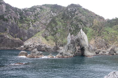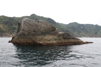 海上は「凪」、ほとんどの磯は渡礁可能。船長に「イサキの釣れる磯」にと依頼。すると、鍛冶屋浜の沖に位置する「トヨキ」に上がった。