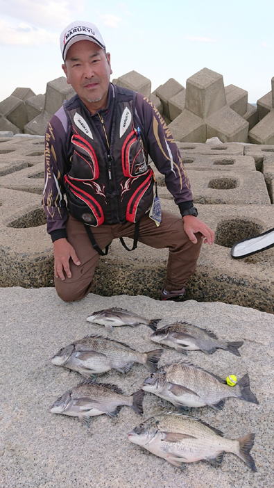 | ●名前 黒澤一天 ●天候 (曇り) 水温 (15℃) 潮 (中潮) 波 (2〜3m) ●日時 平成30年5月4日(金)6日(日) 釣行時間 06:30〜17:00 ●釣り場 茨城県台浜ヘッドランド ●釣り方 ウキフカセ釣り ●魚種 全体的な2日間の釣果 クロダイ 32〜48cm 15枚 ●使用したウキ「クリアー凸(L)イエロー(5B)」「アルミエンスイ(L)イエロー(5B)」 5月4日(金)今季初、地元の鹿島灘台浜ヘッドランドに挑戦してきました。 低気圧の通過に伴い波は少し高め! タフコンディションの中、私の師匠である、伊藤 武さんと共に釣行させていただきました。 ヘッドランドの両サイドはどうにか釣りができるので、波のこない安全な場所に釣り座を構え伊藤さんと別れて釣りをスタートさせます。 私の入った釣り座は北方向の内側になり、堤防のキワを離岸流が走っているポイントです、そのキワを離岸流に乗せてクリアー凸をうまく流していくと回り込んだところにある沈み根付近でウキに繊細なアタリが出ます! ウキが沈み根にもたれかかるようなアタリが出始め、タイミングを見計りアワセを入れるとフッキングに成功、クロダイがヒットしました! 釣り上げたクロダイはそれほど大きくはないのですが、私が信頼をしている「金龍鉤 勝負ちぬ ストレート 3号」ががっちりフッキングされていました。 その後、風が回り込んで来てしまい悪状況になってしまったところで釣り座を伊藤さんと同じところに変えました。 波が立て続けに入ってくる中、伊藤さんはわずかなさし具合の変化で怒濤のヒットを連発させ、48cm頭に3枚揃え、タフコンディションの中良い釣果を出していました。 伊藤さんが釣り上げたクロダイのウキアタリはとても良く出ていて、活性が高いのが伺えます。 私は釣り座を変えたタイミングでウキをチェンジします。 クリアー凸からアルミエンスイに変え、波が入ってくるのでスリムな形状で揉まれる抵抗を少なくする作戦です。 その後、どうにか40cmオーバーを2枚追加することができ合計で3枚の釣果をあげる事ができました。 5月6日(日) 4日の釣果がとてもよかったのでまた午前中限定で釣行してきました! 途中から伊藤さんとも合流し、釣りをスタートさせます。 ウキ工房茨城支部のメンバー・高瀬さん・宇佐美さん・石川くんも釣行に来ていてとても賑やかに釣りをすることができました! 09:00を過ぎたあたりで、まずはファーストヒットで伊藤さんが竿を曲げています! 45cmオーバーの良型をなんなく取り込んでいます。 それに引き続きウキ工房茨城支部のメンバーもヒットを重ね、午前中だけで5枚の釣果が出ていました! 私は午前中で納竿に致しましたが、午後からも釣果がでて、伊藤さんは46cm頭に5枚の釣果、その他にウキ工房茨城支部のメンバーや地元アングラーの釣果を合計すると優に二桁を超す高釣果がでていました。 今年は水温の上がり具合が安定しており、GWの連休から早い釣果が出ているのでとても楽しめた2日間になりました。 茨城県鹿島灘ヘッドランドの好調期はサイズ共に釣果はグッと上がってくるのでこれからを楽しみに通いたいと思います。 ※金龍鉤 official website 「http://www.kinryu-hline.co.jp」 ※ 黒澤一天の…クロダイ修業!?一天勝負!! 「http://blog.goo.ne.jp/03220429」 上記のwebでも、釣行記を紹介させていただいています。 こちらもよろしくお願いします。 BACK |