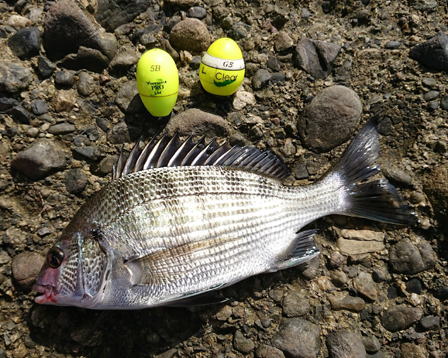 | ●天候(曇り時々晴れ) 潮(中潮) ●日時 2018.8.29(水) ●釣り場 かんぽ下の磯 ●釣り方 ウキフカセ釣り ●釣果 クロダイ25〜35cm 4匹 ●使用したウキ クリアー凸(L)(イエロー)ターゲットプロ(LM)(イエロー)各種 0〜G3 ●コメント 連日の暑さは異常で釣りに行くのもなかなか厳しい状況! それでも、クロダイを求め、釣行してきました(笑) 今回はリバーサイドちぬに挑戦です。 大洗にある宿泊施設「かんぽの宿」に隣接する遊歩道からアクセスする地磯へ釣行してきました! 今回も毎度お馴染みで私の釣友でもある、ウキ工房茨城支部の石川くんとの釣行です。 釣り場に入るなり、下げ潮からの潮回りで回りを見渡すと川からの水が多く最初は厳しい釣りになるのかと覚悟をしていましたが、仕掛けを作り釣りをスタートさせるとウキの浮き方で意外に川の水は上っ面だけで海からの潮はきっちり入ってきていました。 午前中は特に反応もなく、相変わらず元気なチーバス(セイゴよりも小さいサイズ)とハクがヒットして来ていてクロダイは渋い状況が続きます。 昼休憩をはさみ、少しコマセを切らしてからすぐに石川くんがヒット!! 小さいですが手前の沈み根付近で早掛けでカイズをゲット。 私は…沈黙…が続きます(汗) 早掛けした石川くんは仕掛けをきっちり入れ込む重い仕掛けで釣っており、私とは正反対の仕掛けを使用していた為、少し不安を感じながら釣りを続けているとウキに微妙な反応が出始めます。 とにかくハクが多くコマセをまともに入れると仕掛けは馴染まず、付けエサはかじられ悲惨な状況! コマセを先行で打ち、ウキの着水位置と付けエサの着水位置をずらしなから仕掛けの投入直後に付けエサにハクがよらないよう、頭がそちらに向かないようにコマセをしっかり打ち込みハクを誘導させると仕掛けはきっちり馴染み上の潮で滑っている「ウキ工房 クリアー凸」に引っ張られる形になると微かな前アタリが出ます。 ウキの頭を少しだけ沈ませ押さえ込む微妙なアタリです! 微かなアタリであわせを入れても乗り切らず、きいていてもそれ以上反応を見せてくれない感じだったので、カイズもしくはクロダイが付けエサを口にして気に入らないシチュエーションなんだなぁ〜っと確信していました。 ここのタイミングで「ウキ工房 クリアー凸 0」から「ウキ工房 ターゲットプロ G3」にチェンジします。 0からG3の変更は川水が増えても浮力を保っていられるように考えてG3に変更しました。 残浮力は板鉛にて調整を行い使用していました。 それから細かい事をコツコツしていきジンタンの付け替えを何度となく行い、やっと本アタリにこぎつけると35cm前後のクロダイがヒット、そこから連続で3枚追加して気がつくと周りは暗くなりはじめこのままでは夜釣りになってしまうので納竿と致しました(笑) ファーストヒット時使用していた鉤は…「金龍鉤 勝負ちぬストレート 2号 」(自重0.068g)でしたが、ジンタン8〜5を付け替えしている仕掛けを使用していて、ジンタンの微妙な重さでまるっきり魚の反応が変わってきている状況だったのでその後はよりナチュラルに仕掛けを入れ込め、流して行ける「金龍鉤 勝負ちぬSS 2号」(自重0.066g)に変更してしっくり行く仕掛けにすることができました。 私の釣り感覚ですが、自重0.002gの短軸の鉤! 正直、どのくらいの重さかも体感することもできないぐらい細かい重さですが、鉤の形状なり、この細かい重さ・形状の違いで潮の馴染みが異なり魚にしてみれば大きい違いだと私は感じております。 魚の状況を教えてくれるウキも重要でスタート直後から使用していた「ウキ工房 クリアー凸」(下ぶくれで潮のりがよく私がオールラウンドで使用していくウキです。)でも十分細かいアタリ・絶妙な潮のりを出してくれますがよりシビアな状況になってしまった今回の釣行では「ウキ工房 ターゲットプロ」(どんぐり形状で入りがよく抜けいいので感度バツグンです!)が渋くてもたついていたクロダイの良いアタリを出してくれました。 ウキは感度と潮のりを両立するのは難しく、そこでローテーションできるウキ工房のウキバリエーションはとても重宝する必須アイテムです。 私の釣りは良いウキ・鉤により成り立ちこの特性を徹底的に教えてくださった恩師の岡田進さん、伊藤武さんのお陰です。 上記のような細かい釣りをしなくてはいけなかったり、なにも考えていないなかいきなり良型のクロダイがヒットしたりと魚心を読むのはとても難しいですが、魅力され、また釣りにいきたいと思わせてくれるクロダイなのでこれからも魚心に添える釣りをコツコツやっていきたいと思っております! 9月になっても暑さは収まりを知らず、しばらく続いていくと思うので熱中症に気を付けながらまた魅力されるクロダイを釣りに行きたいと思います。 ※金龍鉤 official website 「http://www.kinryu-hline.co.jp」 ※黒澤一天の…クロダイ修業!?一天勝負!! 「http://blog.goo.ne.jp/03220429」 上記のwebでも、釣行記