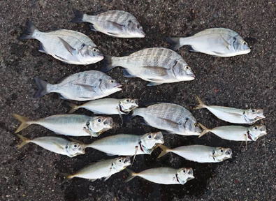 | ●天候・潮・水温 10.7 晴れ・中潮・21℃ 10.14 曇り時々雨・中潮・21℃ 10.15 晴れ・小潮・20 ●日時 2018.10.7(日)・10.14(日)・10.15(月) ●釣り場 茨城県磯崎一文字堤防 ●釣り方 ウキフカセ釣り ●釣果 10.7 クロダイ25〜28cm6枚・アジ25〜30cm9匹 10.14 クロダイ30cm前後3枚・メジナ25cm前後2枚・シマダイ25cm1枚・アジ25cm2匹・シマアジ25cm1匹 10.15 クロダイ22〜31cm3枚・シマアジ25cm前後2枚・アジ25cm1匹 ●使用したウキ おかだどんぐりPRO-R(LL)1号 オレンジ キャッチ(L)B イエロー クリアー凸(L)0〜G3 イエロー クリアー凸(L)5B イエロー ●コメント 10月7日(日) この日は台風の影響で全国的に悪天候に見舞われ、当初参加予定していたマルキユーMFG大会も中止になり地元での釣りもできないかと諦めていましたが、台風が少し日本海側にそれてくれたおかげで太平洋側の茨城県はどうにか釣りができる天候になり釣行することができました。 釣り場は阿字ヶ浦と磯崎港の間にあり砂浜から伸びている「磯崎一文字堤防」に私の師匠であり、ウキ工房フィールドテスター 伊藤 武さんと釣りへ出掛けました! 後から私の後輩でウキ工房茨城支部の田中 佑紀くんが合流予定です。 釣り場は磯崎港側と阿字ヶ浦側があり、どちらも良い釣果が期待できる釣り場です! この日は釣り人が多く、風などの影響も考え、堤防の中間ぐらいの磯崎港側に最初入りました。 足元には基礎石が斜めに入っており、5mぐらい先から深くなっていてキワ狙いでもさらに先の遠投でもクロダイの釣果は期待できます。 「クリアー凸(L)5B イエロー」をセット、エサ取りの多さを考え遠投から攻めて行きます。 午前中は特に変化もなく、コマセを撒くとエサ取りの大群に囲まれてしまい、付けエサを通しにくい状況が続きます。 阿字ヶ浦側へ場所を移動した師匠 伊藤 武さんが「アルミエンスイ(L)G3 オレンジ」を使用して沈黙を破りファーストヒットを引き出します!! 釣れてきたのは茨城県ではとても貴重な尺アジです♪ そこから連続ヒットで尺アジが爆釣! ヒットが止まりません!!! 私も場所を移り、「クリアー凸(L)G3 イエロー」にすかさずチェンジして、アジをヒットさせます! 私と一緒に場所を移動した田中 佑紀くんもアジに引き続き、クロダイを6連続ヒットさせ本日の竿頭で納竿にいたしました。 10月14日(日) 私の所属するウキ工房茨城支部の例会が予定されていましたが前日の予報が急に変わってしまい、午前中の雨と北東の風が吹く予報により安全を計り中止となりました。 そんなこんなで先週に引き続き師匠の伊藤 武さんと磯崎一文字堤防で竿を出すことにしました。 なんだかんだタフコンディションに強い堤防なので、良く釣行します! 地元の方もたくさん釣りに来ていて、秋になると釣果が期待できるので人気な堤防です。 今回は堤防の先端が空いていたので先端へ入らせていただきました。 先端はいつも潮通しがよく、水深もありなかなか面白い釣り場です。 私は先端の阿字ヶ浦側で竿を出すことになり、先端方向に流れが複雑に入るところだったのでしっかりタナを意識して「おかだどんぐりPRO-R(LL)1号 オレンジ」を選択しました。 潮のぶつかるあたりにうまくウキが入り、ファーストヒットは私が手のひらサイズのメジナを釣り上げ、その後は夕方にかけ先端で釣りをしていた師匠の伊藤 武さんが「キャッチ」を使用した2段ウキ仕掛けでまたまた爆釣です♪ 下ウキにクリアー凸を付けパイロットにして沈ませ、上ウキのキャッチを全層スルスルでラインやウキのしもり具合でアタリを取っていく釣法です。 クロダイにアジ・シマダイ・シマアジを次々に釣り上げて行きます! 私も師匠の隣に移り、最後の最後にクロダイ1枚釣り上げることができました! 10月15日(月)この釣果を聞きつけた、釣友のウキ工房茨城支部 石川 裕也くんとまたまた竿を出してきました。 石川 裕也くんはやる気満々です! この日も前日釣果が出た先端まわりに入ります。 2段ウキ仕掛けをセット! 「キャッチ(L)B イエロー」 「クリアー凸(L)G3 イエロー」 前日よりうねりが少なく、風もあまりなくとても釣りがしやすい状況でした。 何投もしないうちに、ファーストヒットで石川 裕也くんが掛けます! キラキラしたキレイなクロダイがあがってきて、無事取り込んだすぐあとに連続でヒットに持ち込みます! その後、私も負けずにヒットさせますがクロダイではなく元気がある美味しいお土産のシマアジが釣れてきました! 仕事があり、昼までの釣行でしたが、納竿間際にネリエサをしっかり2本ちょっとまで入れ込んで行くと、キャッチがわずかに傾きじわ〜っとしている感じがしたのでラインに張りを入れたとたんキャッチがキレイにしもっていきすかさずアワセを入れると今までの魚より少し手応えが重くサイズUPの魚だと確信しました。 釣り上げたのは30cmを少し越えるクロダイで、ここのところの釣果の中で一番大きなクロダイが出てくれたことにとても嬉しくなりました。 諦めずに最後まで
