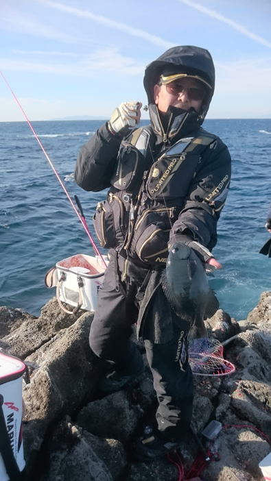 その状況でも 岡里くんが朝イチに47センチのメジナをゲット!