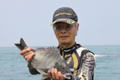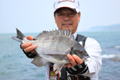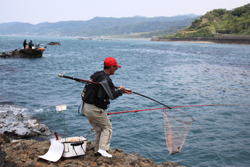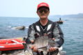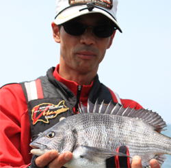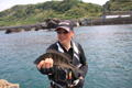 | 新潟県能生海岸・トットコ岩・ヒヨコのクロダイは乗っ込み真っ最中! いつもの年ならゴールデンウィークが私のクロダイ釣りの開幕で、能登半島、新潟と北上して行くのだが、その能登釣行の前々日、大量の黄砂でクルマが汚れたため、洗車をしていると腰が"ギク!"・・・「ヤバイ」・・・洗車は中断して家の中で横になるがすでに遅し・・・夜になると寝返りもできなくなってしまった。 「北村さん、ごめん、能登行けなくなった。ギックリ腰だ」と言うことで北村さんや庄内の仲間からの好釣果の報告を受けるも寝たきり老人の私はただ涙!・・・悲惨なゴールデンウィークとなってしまった。 そんな訳で今回の釣行が今シーズン゜のクロダイの開幕で、いつになくヤル気満々で出かけたのだが心配なのは状況よりもガタガタになった"腰"・・・で、取り合えず案内してくれる長野支部のメンバーに歩かなくて済む釣り場をリクエストすると「分かってますよ、エイハブ船長を頼んでいますから。能生の「平島」でいいですか?」しかし、行って見るとすでに2人の人影があるため、この能生漁港の北に点在する「トットコ岩」に移動した。 見る方向によりニワトリに見えるところから「トットコ岩」と呼ぶらしい。 この日は関東から3人そして庄内から2人、これを6人の長野支部のメンバーがサポートしてくれるのだが、メンバーは私の場合はサポートではなく介護だと言う。この長野の連中だが松本の暴れん坊・土屋勝正から「おやじに釣らせるな」と言う指示がでているらしく、この日の刺客は吉本とのこと。しかし、吉本なら願ってもない。カレは磯の上のオモチャなのだから・・・1番北にある名も無い小さな磯に庄内のクロダイ番長そして「チーム・ローガンズ(老眼)」のリーダー北村、その手前に長野と庄内のメンバー、私は足場が良く平らな「ヒヨコ」に・・・暴れん坊・土屋は1番南に位置する釣り場に入った。(大きなトットコ岩の近くにあるから「ヒヨコ」かぁ〜適当な名前だ。きっと土屋が付けたのだろう) それにしても要介護の私を相手に情けない。よし、「今日は暴れん坊の見える対面でビシバシ釣ってやろうじぁーないか」と対面に釣り座を構えることにした。しかし、南西の風が正面から吹き付け釣り難い。 フィールドプラスの(S)0をセットしてウキ下3ピロで20mほど沖に振り込む。 一投目、すぐに風で手前に寄せられてしまう。どうやら潮は動いていないようだ。そこでウキをフィールドプラス (SS)Bに変更し、ハリスにG3とG5のガン玉を段打ちにすると仕掛けが戻されるのが遅くなり二投目で早くもアタリ!・・・しかし、クロダイではなくメバル。 そしてウキ下を竿1本半にし、底を引きずると三投目でクロダイがヒット!・・・ 「もう釣りやがった、ヤッてらんねー」と吉本の声。35cmほどだが時間をかけて取り込む。これで対面の暴れん坊にプレッシャーはかかったはず。そしてこの直後、再びヒットしたが30cmほどの小型のため、リリース。さらに20分ほどして今度は42〜43cmをゲット。ここで・・・ 「吉本、ここでやれ、まだエサが残るからすぐ釣れるぞ、オレは内側を狙うから」と釣り場を譲る。これには狙いがあり、まず、私の釣れたポイントで食わせられない吉本をオモチャにし、さらに食わせてもバラすことも期待。さらに更に、ここの内側の釣り場は「なんどやっても釣れたことが無い」と言う暴れん坊にプレッシャーをかける。これらが狙いだ。現に短時間だが私も2回ほど竿を出したことがあるがフグが多くて釣れなかった。しかし、水深も2.5ヒロほどで根が多く大型が食いそうなポイントだ。 ポイントを内側に移した私は毎回のようにハリが無い。大型のフグが底付近にいるようた。しかし吉本は案の定「エサが残るんだよね、アタってもウキが戻っちゃう」と、こちらの狙いどおり苦戦している。これは、正面からの風で潮が上滑りしているため、エサを先行させることは出来ない。ウキが仕掛け(エサ)を引っ張っている状態で仕掛けが流れるためクロダイがエサを口にしたときウキ(フィールドマスターM(B))がその咥えたエサを引っ張ってしまうからだ。そのため、可能な限り小さいウキを使用することでクロダイがエサを咥えたときウキが引っ張る抵抗を少なくするのがこの状況ではベストなのだが吉本の使用しているウキはMサイズで大き過ぎる。向かい風のためだと思うが、強風でも無い限り小粒のウキでも充分釣りは可能だ。この日の風速はおよそ4〜5mで現に私はフィールドプラス (SS)で充分釣りになっている。小粒のウキの方が上潮の影響が少なく、エサを先行できない状況のときは食い込みが良い。 移動した私のポイントだが1時間ほど経過すると時々エサが入るようになり、ちょっと潮が動いた途端にヒット!・・・今度は良型のようで引きが強い。これも土屋を意識し時間をかけて取り込むと42〜3cmほどだ。この後、潮が動く、あるいは風が一瞬弱まるなど風による上潮の影響を