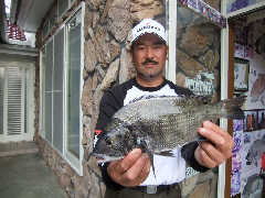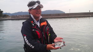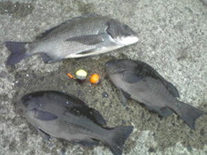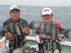 | 『千葉県 富浦。秋磯バリバリ釣行...?。』 10月も半ばを過ぎ!関東地方も大分秋めいてまいりました。今年の猛暑の為か水温低下も遅く?海もまだ夏の様相?、エサ取り軍団は超〜!元気である。そんな中、千葉県富浦磯で10月16日(土)に開催されるマルキューチヌ釣り選手権の全国予選大会に合わせ、秋!真っ盛りの富浦磯を2日間満喫してまいりました。予選会当日16日。私は、共栄丸の二番船でモッソーに渡りましたが...!良型のバリの猛攻...(汗)であえなくバリバリに撃沈...?(涙)。ウキ工房茨城支部長で鬼掛けフィールドスタッフの橋本君、真弓さん、金龍針スペシャルスタッフの中村さん、黒澤君も最後の最後まで粘りましたが!潮が動かず、クロダイからのアタリが無いまま?タイムアップ...。惜しくも涙を呑んだのであります?。そして富浦磯の第1日目の釣行は、幕を閉じたのであります。そして大会スタッフとして活躍した鈴木勝也君も合流!宿の鳴釜渡船に戻り、釣りの疲れを癒す為に風呂に入り...!美味しい料理を肴に残念会を兼ねたプチ宴会です。釣り談義に花が咲き?気が付くと缶ビールと焼酎の空ビンが山のようです.. .!。(汗)。明日は、橋本君と真弓さんは、富浦の動く?一級磯(船でカカリ)で本石!を狙うとのこと!。我々ウキフカセ釣り部隊は!昨日の敵討ちを兼ね?坂下と雀に渡礁予定です。『大分呑んだな?。』『ハ〜ッ〜フ〜ッ!。』『眠くなった...?。寝るか!。』『カッチン!。』『zz..ZZ..ZZ...!。』イビキもバリバリ!夜はふけて行きました。 明けて2日目の17日です。朝4時に起床し解凍をお願いしたオキアミを受け取り。富浦旧港で渡船を待ちます。橋本君と真弓さんは、石鯛用のヤドカリを割っています。これが大変んとのことです。船長に若船長のケンちゃんに挨拶を済ませ、私と黒ちゃんは『坂下』へ。勝也君は『雀』に渡り釣りを開始します。黒澤君に『坂下』の大体の狙い場所を説明し黒澤君も釣りを開始。私の本日のマキエサは、マルキューのチヌパワーG2を一袋にオキアミ3キロを混ぜ合わせ、付けエサに食わせオキアミスペシャルLと食わせオキアミスペシャルチヌLを用意しラインはゴーセンのサスペンドBYスペシャル1.75号にハリスは、昨日に引き続きフロロファイタールーツの1.25号をチョイス、ウキはフィールドプラスのG3をセットし、確り金龍針のグレ(メジナ)7号に付けエサを付け第1投。マキエサには昨日と同じエサ取り軍団のサンバソー、海タナゴ、木っ端グレ、小女子、ボラ...。ぐちゃぐちゃです。すると!黒澤君の竿が曲がり!小型ながら口太メジナがヒット。私にも『ジワジワ〜?』『ビシッ...。』バッドまでしめ込まれ!尋常ではない竿叩き!そうです!バリです。『今日もバリバリ!元気です。』それも40オーバーの良型です。そして、黒澤君も全開バリバリ!。バリを連発します。1時間程バリと戯れ?。釣れない頭をフル回転します。エサ取りが入らないポイントを探し遠投やシモリ根の上などいろいろ探ります。タナは1ヒロ半まではエサ取り軍団?2ヒロより下はバリです。狙いのタナは1ヒロ半〜2ヒロで決定。それに合うようにマキエサも調整します。チヌパワーG2ベースの配合にチヌパワーダッシュを加え調整し、絶対に食いこぼした7種の粒にタブレットがクロダイに届くと信じ再開!。30メートル程遠投し左から沖に向かう潮に乗り良い感じです。仕掛けを回収すると付けエサが丸まる残ってきます。『居る!。』と確信。再度同じライン狙い。マキエサを潮上に入れ仕掛けを投入!良い感じで流れて行きます。サスペンドBYスペシャルを張って!フィールドプラスをしもらせます。見えないが、2メートル程流れた所にはシモリがあります。クロダイが食うなら『そこ!』『そこで食え?』すると、ジワジワと沈むフィールドプラスが一瞬ブレタようなアタリ!。『ヨシ!。食った!。』竿を立て、煽って根から離します。バリと違う?トルクフルな首振りと引きに、間違いなくクロダイです。クロダイの引きを堪能し浮いたクロダイは40センチクラス。タモも一発で決まりガッッポーズ。そして同じような攻めでカイズを2枚追加。黒澤君にヒットパターンを教え、難とかカイズを2枚釣り上げた。此には黒澤君も顔をクチャクチャにして喜んでいた...。また40センチクラスまではいかないものの、良型の口太メジナも上がり二人で時間も忘れ、夢中で1時40分迄『ガッツリ!』竿を出した。楽しい時間は、過ぎるのも早いもの?迎えの船が見え、素早くかたずけをし磯を洗い流し、船に乗り込み『坂下』を後にした。港に戻るとカカリ釣りを終えた、橋本君と真弓さんがお出迎え。聞くと3.1キロを頭に二人で4枚の石鯛を上げたとのこと!。『すっ〜げっ〜!』お見事です。『雀』に渡った鈴木勝也君もメジナは相当上げたようで!ものすごい!エサ取り中からカイズも確り上げていた。流石です。その後、皆で記念撮影を済ませ荷物を車に積み込み、2日間楽しんだ富浦磯を後にして家路に着いた。 此れから富浦磯は、メジナやクロダイ