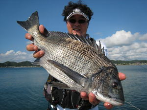 この場所は、以前、千葉支部の宮永さんに教えて頂き、奥さんの「真美タン」も一緒に3人でクロダイを釣った思い出の場所。また、MFG千葉大会の本部会場としても有名です。その時は、真美タンが大型のクロダイをキャッチし、私は小型の数釣り。旦那様の宮永さんは・・・という釣り場で、車を置いて歩いて30秒の私好みも釣り場。釣りを開始したのはPM2:30・・・ウキは、私のお気に入りの「デルタEX Sサイズ(ピンク)0」をセットし、ハリスに仕掛けを落ち着かせるためのガンダマG8を段打ちし、タナを底ギリギリにセットして釣りを開始した。この場所は、水深約3m。手前にはゴロタ石が入っているが、竿1本先からは砂地底になっており、通常エサ取り少ないのだが、なにせこの気温ですから、多くのエサ取りを想定して「ネリックスサナギ」・「くわせネリエサチヌ」・「魚玉ハード」を持ち込み、更にコマセにも「フグバイバイ」を添加し万全の状態で望みました。しかし、その期待を裏切るかのように、付けエサの「くわせオキアミSP−L」が残る状況でした。そのため、そのままオキアミで釣り続けました。初めのうちは、たまにエサを取られたりしていたのですが、次第のオキアミが残ってくるようになり、しかも海面には大型のボラがコマセの周りに集まり始めました。加藤さんと二人顔を見合わせ「ニターッ」と笑みを浮かべながら集中して狙っていると私の愛する「デルタEX Sサイズ(ピンク)0」が海中へ消しこみ、さらにリールの糸を抑えている指を弾き飛ばすアタリが!ハリスを1.2号にしていたのですが、サンラインの「松田競技SPブラックストリーム」を使用していたので、丁寧かつ慎重、そして大胆にやり取りを行い、海面に飛び出したのは良型のクロダイ。