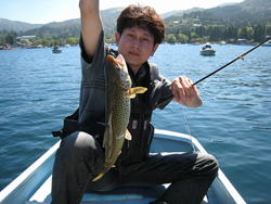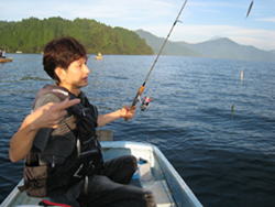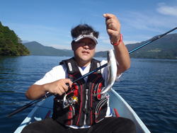 最近は、秋を感じさせるようになってきました。「秋」といえば「食欲の秋」魚でも、野菜でも、美味しくなるシーズンですよね!・・・そう、私の大好きな季節がやってきました。そんな秋が近くなった9月22日(水)芦ノ湖へワカサギ釣行してきました。 芦ノ湖は、これから各所で釣れ始まるワカサギ釣りの関東で一番早く釣れ始まる釣り場。 そんな芦ノ湖でワカサギが最近釣れ始めたという情報を聞きつけたので、同僚のケンチャンを引き連れて釣行しました。と、言っても半分は業務・・・シーズンを先取りして、お店でのコーナー作りのために・・・お世話になったのは、箱根湾の「くろさわボートさん」 くろさわボートさんの情報によると、シーズン始めのワカサギは早朝の2〜3時間でバタバタと釣れ、その後は釣れなくなってしまう。とのこと。 そのため、ワカサギが釣れなくなった後はBIGトラウト狙いで秘密のポイントに連れて行ってくれるという。 早朝、くろさわボートさんに到着し、挨拶・受付を済ませた後、船外機ボートにてポイントまで連れて行ってもらった。 ポイントには、多くのワカサギ釣りファンのボートがおり、各ボートとも仕掛けにはワカサギが鈴なりになって釣れ上がっている。 私達も、すぐに準備して仕掛けを投入!すると、すぐに竿先にワカサギのアタリが・・・ 慎重に上げてみると、ワカサギが鈴なりで上がってきた!!!このシーズンの芦ノ湖は、空バリの仕掛けで釣れるためエサ付け不要!それが、また面倒くさくなくて良い!(笑)そのまま仕掛けを投入。すると、またワカサギが付いているので外して、すぐに仕掛けを投入・・・するとアタリが・・・という感じで、時間が掛からないのが嬉しい。ケンチャン、寝てないで写真とってよ・・・ その後も、ワカサギは順調に釣れ続いたのだが、話の通り数時間すると釣れなくなってしまった。 そのため、ボートを「BIGトラウト狙い」の場所へ移動させてもらい釣りを開始。トラウト狙いのタックルは、おなじみのシマノ極翔クロダイ0.6−530にBB−XテクニウムMG2500DXGの組み合わせ。リールには、サンラインのダイナード1.7号が巻いてあり、そのタックルにキス用片天秤15cm+オモリ3号をセット。その天秤に、サンラインのナイロンハリスパワードの1.5号を約1.5m付け、金龍の勝負チヌ2号をセット。なんか、いつもと同じようなタックル・・・(笑)そのタックルをセットし、エサはウルトラバイト?添加のマルキュー「つれ鱒」(イクラ)をセットした。 同行したケンチャンさんは、また寝てしまったが・・・私は、真剣にトラウト狙い! すると・・・開始早々で小型ながらニジマスをキャッチ! 寝ていたケンチャンも少しは竿を出したものの、また眠りに ZZZ・・・ 時間も昼に近くなり「ケンチャン、もうそろそろ終わりにしようか?」・・・入れっぱなしの仕掛けを回収しようとリールを巻くケンチャン。すると・・・「来てるよ!来てる!!」と起き竿にヒットしていたようだ。上げてみると良型のブラウントラウト! その後、私がニジマスを追釣したところで終了とした。 今後もワカサギ&トラウト狙いが有望な芦ノ湖。その他にも、芦ノ湖には遊覧船や駅伝ミュージアムなどもあり、家族やデートで行っても楽しめる場所である。是非、足を運んでみて下さい。 |