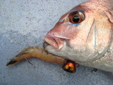 そんな10月12日(火)に千葉県・外房大原港「新幸丸さん」の午後船で「テンヤマダイ」に行ってきました。通常、船からのマダイ狙いの場合、カゴにオモリが付いた「ビシ」といわれるカゴに天秤とハリスをセットし、付けエサにオキアミを用いて釣ることが多いのですが、この「テンヤマダイ」とは、簡単に言うとオモリにハリが付いた「テンヤ」「カブラ」(形が違う)と言われる物にエビを付けて、それを船から落とし込んで釣る釣法で、ゲーム性が高くライトなタックルでできることから最近流行しているマダイの釣り方なのです。この釣行は、いつもお世話になっている「シマノさん」のご好意で、最新タックルを使用した研修釣行。