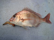 カブラが底に着低したのを確認し、ゆっくり底からカブラを引き上げると・・・「ゴンゴン」と竿に伝わる物があり、アタリかどうかは不明だったが体が自然にアワセを入れた瞬間、マダイ特有の「グングングン」という引きが伝わり、小型ながら記念すべき1投目でマダイをキャッチ!