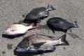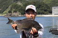 私は、竿1.2号、ミチ糸2号にウキはフィールドプラスS「0」をセットし、ハリス1.7号2ヒロとり直結部分から下0.5ヒロにG5のガン玉を着け、針はキンリュウ針のグレ(メジナ)7号で、3ヒロ半にタナをとりスタート。足元にコマセを撒くと、箱フグがチラホラ見える程度。達也君がコッパメジナを掛けるがサイズアップしない。暫く足元を攻めていると、フィールドマスターがもぞもぞと海中に消えていった。軽く張ると、グーンと強い引き、足元のエグレをかわし浮かせると形の良いクロダイ君。無事タモに収めると50p。ややスマートだが満足。その後、暫らくして達也君が、竿2本の深タナを攻めていたら、強い当りがあり浮かせると38p程のマダイ君。これには、達也君も大喜び。その後、メジナもヒットするがなかなかサイズアップせず、35p止まり。今度は、遠投し深タナ〔ウキをデルタ1・S(2B)に変更、ガン玉2Bとハリスにガン玉G5〕を攻めると、私にも33pのマダイがヒット、これでとりあえず赤(マダイ)青(メジナ)黒(クロダイ)と3色揃った。しかし、その後アイゴがヒットしはじめ苦戦。タナを2ヒロ半まで上げてメジナを掛けるも30〜35p程度。足元にコマセを撒くと、海中はまるで熱帯魚の水槽。横縞模様のサンバソウの幼魚・茶色のアイゴの幼魚・名前は解らないがコバルトブルーの綺麗な小魚等が群れをなしている。水温が26〜27度ぐらいはあると思えた。その後もメジナはボツボツ釣れるもサイズアップせず納竿時間となった。ここ松崎は、冬の西風にも以外に強く又、コンスタントに釣果が得られる釣り場である。