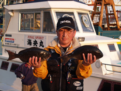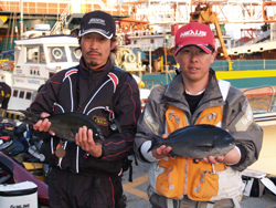 中でも国井氏は福島から伊豆方面に数回釣行しているが、今回初めてメジナを釣ったと大喜び。又、「カド」に渡った吉泉君は、「ゼンパチ」に磯替え後、5号のハリスを切られるバラシが3回あったとのことで、悔しがっていたが、44cmの尾長をゲットしてきた。(相変わらずバラシの吉泉君・・・笑)