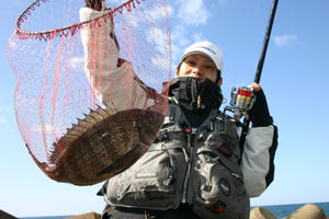 次の9日は、私と紀氏、安達氏、佐藤淳吾氏の4人で向かった、昨日よりは少し波が落ちてはいるものの依然、沖向きは厳しい状況なので南向きを攻める事にしたが2人位しか竿が出せないので佐藤氏と安達氏が南に向いて、紀氏が昨日の内向きに竿を出した、私は釣り座が無いので無理をせずアドバイスに徹する事にした。