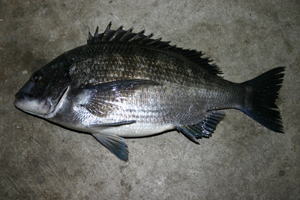 波はやはり高く、行きたいポイントは時折波が洗う状態なので、仕方なく内向きの道路に向かって竿を出す事になった。悪くは無い様なので粘ったが二人してエサ取りも何も釣れない状況が続いた。徐々にではあるが波が少し落ちてきた様な気がしたので一発勝負と思って、狙いたい南向きのポイントにコマセを4〜5杯撒いて竿だけを持って何とかポイントの手前まで出て竿を出した。沖からのサラシで一面真っ白くなっているので、直ぐにウキが見えなくなってしまうのでウキを見るのをやめ、道糸の張りだけで流していくと2投目で緩めた道糸がピンと張り竿先がコンと持っていかれたのでアワセを入れるとクロダイ特有の引きが伝わってきた。ラッキー・・・取り込んでみたら45pのパンパンに太った乗っ込みのクロダイだった。