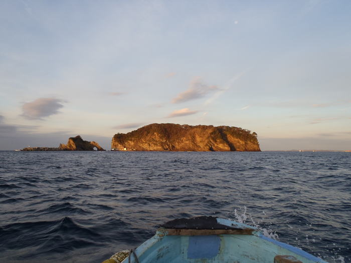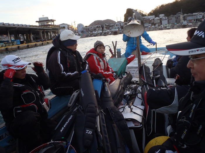 海の状況から浮島本島の沖向かいのポイントに各2名づつ渡船し13:00の沖上がりまでに黒鯛か メジナ1匹の長寸で競い合います。この日は各ポイントでエサ取りに悩まされたり、 全く潮が動かなかったり、終了時間まで日が当らなく寒い思いをしたりと、とても大 変な例会となりました。