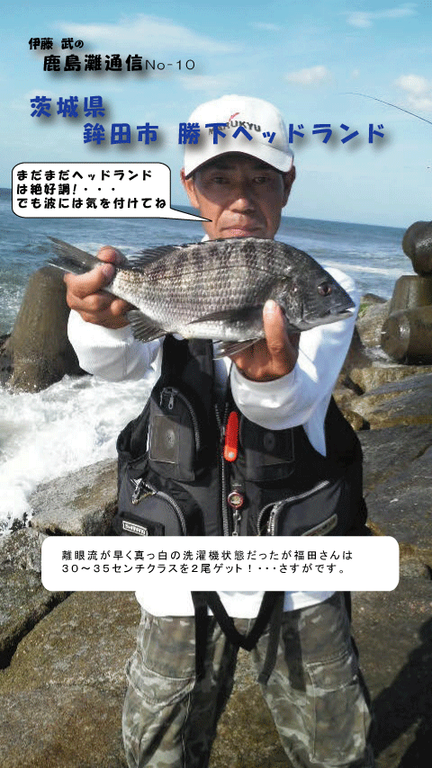 茨城県 鉾田市 勝下ヘッドランド。 7月25日、土曜日 私は、MFG関東の本部会議に出席する為に埼玉県マルキュー桶川本社工場に行ってきました。岡田さんや沢山の釣り好きのスタッフと会えるので楽しみな予定の1つです。 今回は、ウキ工房の長男坊のクロダイ番長こと、秋野さんが欠席の為、ちょっと寂しい会議となり残念です。 さて、会議中でもやはり茨城支部のメンバーから、海の状況やらお勧めポイントを教えてなど、いろいろメールが届く!。 本日は前線の通過で波が高く余り海の状況は良くないようだ。 お昼頃からは、状況は更に悪化!・・・メンバーからも次々に諦めメールや連絡が入り、夕方の上げ潮待って勝下ヘッドランドに入った福田君と佐藤君から「クロダイを上げたよ!」とメール!・・・やってくれました!。メールを見ると「波が高くて離眼流が早く、真っ白の洗濯機状態だったけど30〜35センチクラスを2枚取りました」と書いてあった。 でも、そんな状態で掛けるんだからたいしたもの!・・・さすがア〇ルパール釣法の第一人者と心の底で叫んだのは言うまでもない。 まだまだ絶好調、「明日は鹿島灘ヘッドランドに行くぞ!」と我慢して会議に集中したのであった。 明けて、26日の日曜日。海は昨日より凄い事に!・・・バッカンを持ち波飛沫を浴びながら朝陽を見上げる私であった。何か悪いことしたっけ?.............. エサ・問い合わせ フィッシング大洗店 рO29−269−8000 フィッシング鹿嶋店 рO299−90−7766 http://www2.ocn.ne.jp/~ooarai/ BACK |