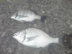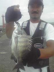 茨城県 那珂湊港 中堤防で午後からまったり、カイズ狙い。 8月2日、日曜日。午前中は仕事で、午前11時頃に家に戻りました。帰りに那珂川を見て帰り、上流の栃木県で前日雨が降ったのか、河口は良い感じに濁りが入っています。 家に戻り、釣りの支度をして通いなれた那珂川の河口に位置する、那珂湊港の中堤防に行くことにした。今日はさほど暑くはなく、釣りやすそうである。 釣り場の中堤防に到着し先端部まで一通り見て歩くと、表層にはボラの大群と足下から竿二本までは、ふぐと木っ端メジナが群れているのが確認できた。まだクロダイは(カイズ)上がっていないようだ。釣り座を先端部から30メートル手前に取り、14時30分頃釣りを開始した。水温は19.5℃である。今日は、オキアミ3キロにマルキューのダッシュ一袋、ムキパワー白を半袋合わせ、付けエサに食わせオキアミスペシャルチヌLをチョイスし、ウキはトーナメントSP-RのB、 Sサイズオレンジをせっとした。狙いは沖目のカケアガリで竿一本前後のタナである。 開始して数投は、もやもやとしたアタリが出るものの、なかなかハリがかりせず、やはり16時の満潮から下げ潮に入らないとダメかなと肩を撫で下ろす。ウキを沈めたり、トーナメントSPの0に変えスルスルで狙っても、表層だけ流れる二枚潮でなかなか仕掛けが入らない。ここでちょっといっぷくです。フィッシング大洗店のお客さんが竿を出していたので暫し談笑して戻ると潮が流れ始めたのか鏡潮が出始めています。時間は16時30分を回り下げ始めです。しかも、船道のカケアガリ付近に良い潮目が出ています。竿下にエサ取り用のコマセ入れ、遠投再開です。他の釣り人はフグばかりですが、コマセで上手く分離出来ているのか?フグが私のポイントには入って来ません。時折付けエサのオキアミも戻ってきます。ここは集中と、確りコマセを打ち分け仕掛けを遠投して、潮目を捉えて右から左に良い感じでウキが流れていきます。すると!『きた〜ッ!』と言う声に同時にビックリです。フィッシング大洗店のお客さん。私の左側に釣り座を移していたのです。慎重にゲットした30センチのカイズです。此で気合い入りまくりです。確りタナを取りたいのでトーナメ ントSP-R2Bにチェンジして数投目?。じわ〜っと愛用のトーナメントが沈んで行った。ちょっとラインを張り竿に来るまで待ち、『コッン!』。向こう合わせが決まり30センチ程のカイズです。一気に抜き上げ取り敢えずキープ。再度同じ感じで26センチ程のカイズが顔を出してくれました。 私の狙うポイントにはフグ等はおらず、確り付けエサがタナまで落ちるのか?ソゲ(ヒラメ)がその後二枚ヒット。確りコマセを撒いたせいか?コマセが無くなり、釣り座を流し竿を納めた。キープした魚は後ろで釣りをしていた。やはりフィッシング大洗店のお客さんの初老の夫婦に分けてあげ〜!喜んでいただきました。 ようやく、20℃の海流も入り出し、カイズ釣りのシーズンがやって来ました!。ここ那珂湊港では、カイズ混じりで荒天時や川濁りが入ると50センチオーバーも期待できるので一度竿を出してみてはいかがだろうか。 ヒットウキ トーナメントSP-R 0〜2B Sサイズ オレンジ エサ・問い合わせ フィッシング大洗店 рO29−269−8000 フィッシング鹿嶋店 рO299−90−7766 http://www2.ocn.ne.jp/~ooarai/ BACK |