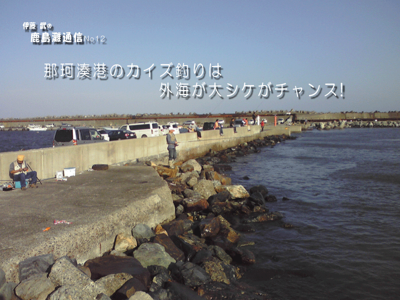 那珂湊港のカイズ釣りは外海が大荒れのときがチャンス! 最近老眼鏡のお世話になりそうな伊藤です。ハリ結び機買おうかな........?真剣に考えてます・・・? シルバーウィーク中は台風の影響で波が高く、太平洋の外海は竿が出せる状態は無く湾内の釣りにレッ〜ラ〜ゴーとなりました。那珂湊港のカイズ釣りは荒れて良型が港内に入り込むためかなり期待が持てる釣り場です。ただ家から近いというだけですが....。 20日の日曜日は那珂湊港の左岸堤のゴロタです。茨城支部のこの頃腕を上げている?ペロちゃん事!宮崎君に私が世話人をつとめる『宝山海』の若手黒澤ちゃん、佐藤ちゃんの三人が同行です。 先ずオキアミ3キロにマルキューのチヌパワーV10白チヌにムギパワー白そしてフグ対策の秘密兵器をブレンドし付けエサに食わせオキアミスペシャルチヌをチョイスして各自『ウキ工房のウキ』をセットしてスタートです。私は、トーナメントSP-Rの0をセット調整ガンをセットして仕掛けが立ったら沈んで行くように設定し、海中を仕掛けにハリを持たせジグザグに探っていく方法です。ラインにゴーセンBYスペシャルの1.75号にハリスはフロロファイタールーツの1号をセットしてスタートです。始まり20分程たち私に、クッ?クク〜ン!小気味良いカイズの引きが竿先から伝わりカイズの登場です。 そして、ペロちゃん事宮崎君にアタリです。クン!クン!カイズです。黒澤ちゃんと佐藤ちゃんも竿を曲げて居ます。開始して間もなくカイズの鱗祭りです。同行の皆が型を見て最終的に20枚程上げました。 9月22日は那珂釣遊会のこうじ君からメールを頂き早く那珂湊港の新堤防の内側に来なさいとメールです。荒れて良型が湾内に入って居るらしく、40センチクラスが三枚上がっているとか?。急いで仕度をし釣り場に急行し挨拶そこそこに釣り開始し、カイズをパタパタと釣り上げ正に時合いです。 私は、ゴーセンのハイサスペンドT-1の1.75号にフロロファイタールーツの1.25号に物を言わせ一気に抜き上げ、手返しを早目ます。那珂釣遊会のこうじ君やマモさん事佐藤守さんも次々に竿を曲げて正に入れ食いです。ひときは大きく竿を曲げたのは、シマダイの30センチクラス!。 終始入れ食い状態でこの日も全員安打の二桁釣果!。この日はチヌキラーの3B〜4Bが確りカイズのアタリを伝えてくれました。 23日は、『宝山海』の黒澤ちゃんが竿を出していたので、アドレスがてら見に行くと!。30センチクラスが一枚マルキューの生かしバッカンに入っています。朝マズメの一発で午前中はアタリが無くエサ取りだらけでどうにもならず、那珂湊港左岸堤のゴロタに場所移動し先に竿を出していた宝山海の根本君に話を聞くと?。澄みすぎ、フグだらけでどうにもならず辞めようか?続けようか迷っている様子です。そこでフグ対策マキエを入れチヌパワーダッシュにムギパワー白をオキアミ1.5キロに混ぜ遠投してポイントを探ります。超遠投はエサが残り、釣りやすい範囲はエサ取りだらけです。マキエをウキに被せながらエサが残るポイントやタナを探すと、超遠投と澄み潮で際だけがエサが残ります。竿下に狙いを定め根気良くマキエをチヌキラーのイエローに被せると、フグが抜け付けエサが残りだし、ステルスの0にウキをチェンジ〜ジンタンの7を打ってじっくり沈めます!ジワ〜っとウキアタリ?仕掛けを張ると?グングン〜ギュ〜ン!待望のヒット!元気なカイズです。黒澤ちゃんと根本君にヒットパターンを伝え、三人共に竿を曲げ入れ食い状態でに なりました。スイッチの入ったカイズはマキエに浮いてきます!気が付くと根本君が30センチクラスの口太メジナを上げています。三人で20枚程上げ満足の行く釣りとなり、シルバーウィークの釣りを締めくくりました。 私と黒澤ちゃんはシルバーウィーク中に片手程カイズを釣り上げました。確りカイズのポイントに仕掛け、付けエサを運んでくれた、ウキ工房のウキ、ゴーセンのラインシステムとマルキューのマキエが有ってこその釣行となった。那珂湊港の落ちカイズはこれからが最盛期です。 |