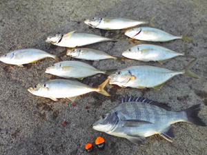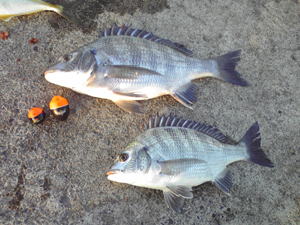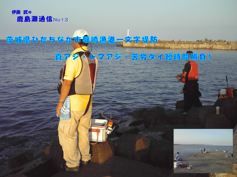 『茨城県ひたちなか市磯崎漁港一文字堤防・真アジ・シマアジ・苦労ダイ短時間勝負』 10月4日、日曜日。彼岸潮を過ぎ、昼間と夜間の潮が逆転して、午後から良い潮が入り時合いが来ることが多い。今日は、大潮です。大洗磯から磯崎漁港まで一通り見て回ったが〜?。何処の釣り場も良い釣果は上がっていない。 これは、やっぱり午後からの上げ潮待ちかと思いきや?。中村さんが合流!。 早速、磯崎漁港の一文字堤防に行くことにした。 岬の先端にあたり、潮通りが良くシマアジや尺アジが良く釣れる釣り場です。おまけにクロダイも狙えるっとあって?急いで移動しました。13時30分頃に磯崎漁港の一文字堤防に到着して急いで支度に取りかかり、先端部に釣り座を構えた。 岬が南風をさえぎるのか風は気になりません。 中村さんは、仕掛けにPRO-RのG3をセット、マキエサにエサ取りに強く、遠投できる。チヌパワームギと付けエサに食わせオキアミスーパーハードをチョイスし私は、クリアー凸の0にキャッチのG3をセット、ゴーセンのハリス、フロロファイタールーツ1.25号にジンタンを二段に打ち、ウキ止めを付けずにスルスルでゆっくり底まで狙います。マキエサは視覚集魚で潮流が解るチヌパワーV10白チヌとムギパワー白を2/1袋と付けエサに食わせオキアミスペシャルチヌLをチョイスした。 開始して直ぐに、中村さんの竿が曲がり、シマアジの登場です。沖に出来る潮目まで流してヒットしたようで、周りがフグの爆釣の中シマアジの25センチ〜30センチ弱を連発し、後ろにはギャラリーが出来るほどです。私の方に潮が寄り始めると、30センチの真アジの入れ食いです。二人でお土産の確保に余念がありません。そして中村さんに強いアタリで、竿が絞り込まれ基礎ブロックに入られてしまいました。もしやメジナ?ここ磯崎漁港の周りは岩礁帯で先ず先ずのメジナも出るんです。『惜しいな〜!中村さん!』と言ってるそばから私も絞り込まれ〜!プッツン!。 最近釣り場で一緒になる、宝山海の佐藤さんも竿を出して三人で再開です。あい変わらず真アジとシマアジが竿を絞ります。すると、時折付けエサが残り返って来ます。クロダイが居るんじゃないのと中村さん?。クロダイのアタリが出るのが、潮の寄り着きの変わる一瞬です。コマセワークや仕掛けを数回チェンジ、私はクリアー凸のBにキャッチの3Bにチェンジ。中村さんはPRO-R0に仕掛けを変えようとしたら!『あ〜っ!ウキが!』『毎度ありがとうございます。』と岡田さんの声が聞こえたような?。 ウキをPRO-RG3のピンクにチェンジした中村さん。周りはアジにシマアジ、サバやワカシも加わりぐちゃぐちゃです。潮の変化のある場所を狙って二人で集中します。潮がゆるんだ一瞬?キャッチがゆっくり視界から消えて行った。『バシッ!ぐんぐん!』クロダイヒット?。沖で掛けたので十分に引きを楽しみ?31センチの小ぶりのクロダイです。続いて中村さんも小ぶりながら本命を上げ、お土産も沢山キープできたので釣り場を洗い流し後にした。エサ取りや青物にも負けず、遠投サビキ釣り師にも負けず、何とかなりました.......。 |