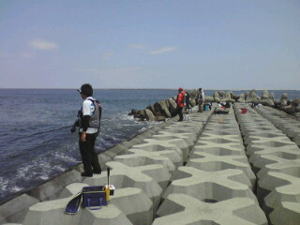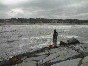『茨城県 阿字ヶ浦海岸・鹿島灘 ヘッドランド。 東日本大震災での励ましやお見舞いありがとうございます。私も釣り始めました!。』 震災から全く釣りをしていなかった私も、49日を過ぎ心にも一区切りついた4月29日の(昭和の日)ゴールデンウィーク初日に地元の阿字ヶ浦海岸で竿を出すことにした。 考えてみると?2月の下旬から実に2ヶ月ぶりで、こんなに竿を出さなかったのは記憶に無いほどだ。 震災から多くのメンバー、釣友から励ましやお見舞いの言葉を頂きました。『本当にありがとうございました!。』この場を借りてお礼申し上げます。 茨城県の海岸線は、まだまだ震災(津波)の爪跡は残っている状態です。でも影響の少ない釣り場には、多くの釣り人が戻りつつあり!クロダイの釣果も聞かれます。 そんな中私の自宅から約5分程の所にある。『阿字ヶ浦海岸』に出掛けました。29日の朝、黒澤くんこと黒ちゃんと待ち合わせ阿字ヶ浦海岸へ。9時頃に到着し、割りと空いている阿字ヶ浦の3番堤防に入ることにした。釣り座は、堤防の中程に構え上げ潮、下げ潮共に効率的に攻められるポイントを確保した。撒き餌さは、マルキューのチヌパワームギ1袋にV9遠投を1袋をオキアミ3キロに混ぜ合わせ、付けエサにスーパーハードBig-Lをチョイスした。海の状況を良く観察すると?ウネリが入り、上潮は効いているが下潮は動いていないようだ。ウキはクリアー凸の4Bオレンジをセットし、確り撒き餌さを撒いて『第1投...。』ウネリが入るタイミングで誘いを入れると?ウネリと同時に手前に戻されてしまう...。底潮も弱く?効いてないよ!と波まかせでラインを打ち返すと?10メートル程潮下に戻ったであろうか?。逆波のミヨ筋に仕掛けが上手く入り!押さえるアタリ!。引き込むアタリは出なかったが、間違いなくクロダイのアタリである。1投目からアタリとは...。『クロダイも震災に耐え?私を待って居てくれた?。』とても嬉しい第1投である。第2投は、そのままエサが帰ってきた。そして第3投目...。タナを1ヒロ上げ!2ヒロにし遠投してミヨ筋を沖から引き釣りをし、足下に撒き餌さを撒き潮の効いているポイントで合わせると...。クリアー凸が『ス〜?。』じっくりと仕掛けを送り込み!『バシ〜ッ!』同時にクロダイ特有の引きが!。『グン!グン!グン!』クロダイの引きは堪らない!。十分に引きを楽しみ取り込んだのは!40センチとまずまずのクロダイである。そして1時間程経った頃に?沖目でヒット!。これは、先ほどのクロダイより引きが強い!。これもじっくり引きを楽しみ取り込んだのは?先程よりアン(兄)ちゃんのクロダイで43センチ。これで私は、黒ちゃんのサポートにまわることにしました。私の釣りのイメージをアドバイスしながら仕掛けを振り込むこと2時間?...。黒ちゃんに待望のアタリ!。確り竿に乗せ沖からクロダイを引き寄せます。『ギラリ...。』『黒ちゃん!良型だっぺよ!。』慎重に私が差し出すタマにキャッチ!。これも43センチです。聞くと?去年の秋前からスランプで、久々だとか?。『43センチやったね! 黒ちゃん!。』このクロダイが上がりチヌになり釣り場を後にした。当日の釣果は、カイズが他で1枚釣れたのみで私と黒ちゃんのクロダイ3枚と言う釣り始めにしては言うことの無い震災後の出だしとなった。 明けて5月5日のゴールデンウィーク最終日(こどもの日)。朝からナライが吹き生憎のシケ模様です...。午後からの上げ潮狙いで!釣り場を見て回り鹿島港のラジオポートや鹿島灘のヘッドランドを見て回った。やはり震災と津波の影響は甚大です。浜には船舶やコンテナ、漁具等が打ち上げられていますが大分片付けられてきています。道路も隆起して走りにくい所は有りますが大分復旧してきています。此からが鹿島灘ヘッドランドの最盛期に突入していく事を考えると、入釣経路が確保出来ていることは、非情に有り難く!作業にあたってくれた方々に本当に有り頭が下がります。鹿島の釣り場を一通り見て回り途中で同じ茨城支部で金龍ばりスペシャルスタッフの中村さんも合流、弁当を購入して中村さんのすすめで小山ヘッドランドに入釣することにした。 沖側は、波が高く釣りを断念しヘッドランドの回り込んだ堤防の内側で開始した。激しい離岸流がかすめている...。ウキは!自重があり操作性の良いメタXの5B、ピンクをセットしてオキアミ3キロにチヌパワームギ1袋、チヌパワーV9遠投を加えまとまりを考え良く練り込んで使用。中村さんと並んで竿を出すのも久し振りです。ややあって、アタリも遠いので遅めのランチタイム...。釣りをしながらの弁当は、何でこんなに美味しいのか?あっという間に平らげ?釣りを再開した。すると潮が上げ離岸流も緩やかに...。これは行けるかも?と言うより早く中村さんが、アタリを取り始めだした。『居るよ!居るよ!』と中村さん。私も丁寧にラインを操作し仕掛けをコントロールします。アタリがあるにもかかわらず、空合わせが続きます...。離岸流が速くクロ
