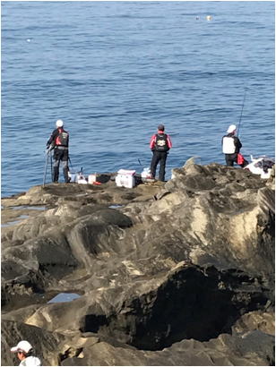 | (この時は、大ボケに上がったメンバー全員は優勝魚と誰もが確信しておりました...。この時すでにドラマ は別の釣り場で起きていたのです。) そして、中林しも続いて好調に竿を曲げていますが!バッカン流しから小島方向に延びるハエ根の際を攻めていた中林氏の竿が一際大きく絞り込まれ!一進一退の攻防の開始です。 ウキが浮いては絞り込まれ!絞り込まれては浮かし!「あ〜ッ!?」奴は海の彼方に帰っていった?。 中林氏「......!」 私も高瀬氏も「今のは!デカイメジナだっぺよ〜ッ!」 「惜しかったぺよ〜ッ!」と一言です。 その後大ボケに上がったメンバーもキープサイズを好調に上げている様子である。 |
