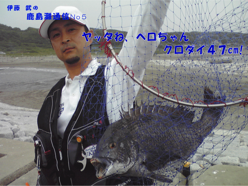 茨城県鉾田市 鹿島灘ヘッドランド 滝浜。 6月28日 日曜日。やはり良い釣果が聞かれるのは!鹿島灘ヘッドランドです。各ヘッドランドで連日50センチオーバーの釣果報告や大型のバラシの話しが飛び込んでくる。そんな中、メンバーの宮崎くん(通称ペロペロ〜!ペロちゃん)から携帯が鳴った。明日の日曜日に釣りに行きましょうと誘いの電話で、即OKして明日のAM4:00に大洗町にあるフィッシング大洗店で待ち合わせることにした。 そして、最近腕を上げクロダイの55.5センチの自己記録を持つ中村さんも誘って三人で釣りをする事となった。明けて日曜日。4:00にフィッシング大洗店に集合!一路鉾田市の滝浜に向かった。釣り場に着くと、海は梅雨ナギのベタ!またと無い絶好のコンディションである。滝浜は今季、56センチも釣り上げられ大型が来る可能性が高い釣り場だけに三人とも緊張感でいっぱいで身支度を済ませ釣り場に向かった。釣り場に着くと、北茨城市の七浜FC、高橋さんのグループと鹿島灘をホームグラウンドにし、今日発会式を行う『宝山海』のメンバーが竿を出していた。(私も世話人として後程出席の予定です。) 話を聞くと、まだクロダイは上がっていない様で下げ潮に入れば何とかなるかなと、言うことである。挨拶と情報交換を済ませ、中村さん、ペロちゃんは向かって右側の南にポイントを決め入釣した。中村さん、ペロちゃんはコマセに、オキアミ3キロにチヌパワーV10白チヌSPを一袋混ぜ合わせ、付けエサに食わせオキアミスペシャルチヌLをチョイスして、ウキは中村さんがMETA-X SP 3Bをセット、ペロちゃんはトーナメントSP-Rの5B オレンジをセットして釣りを開始した。 開始して間もなく!ペロちゃんの竿が大きく絞り込まれた!なかなかのサイズか暫し浮いて来ない!中村さんのアドバイスでラインを出して沖に走らせやり取り開始!。徐々にクロダイも浮き始め、沈みテトラも難なくかわして、私の差し出す玉網におさまったクロダイは47〜48センチの立派な乗っ込みクロダイで、ペロちゃんのクロダイが時合いを呼んだのか、そちこちで竿が曲がり、正にクロダイ、祭りだ?。 そして、又してもペロちゃんのウキがアタリ捉え、海中に消えて行った。バヒュ〜!と合わせも決まり、やり取り開始!。今度は際を走られながらの駆け引きで私や中村さんが竿操作を教え、徐々に向きを変え沖に走らせ、取り込んだクロダイもなかなかのサイズで45センチクラス!。此には、流石のペロちゃんも『ペロペロです』と一言。でもやり取りして取り込んだのは、宮崎くんです。流石です。おめでとう。 そして、私は『宝山海』の発会式に、お昼頃から出席して、我がウキ工房のウキのPRやマルキューファングループの説明など、また鹿島灘ヘッドランドの私の攻略法を話し、釣り場に戻ると、時合いも終わり、雨もチラホラ降りだしたので、17時過ぎ頃にゴミを拾い、コマセを流し釣り場を後にした。 この日は、滝浜は全体で8枚程と余りクロダイが出なかったが、その竿頭は宮崎ペロちゃんです。やったね!。また釣りに行きたいですね!。 最後に、この場をかりて『宝山海』のメンバーの皆さん。発会おめでとうございます。 クロダイ釣り、ウキフカセ釣りを通して、楽しく愉快に行きたいですね。宜しくお願い致します。 |