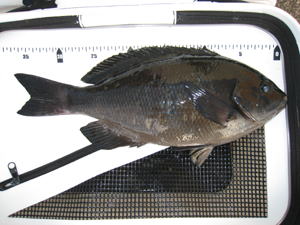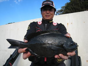 最近、朝晩の冷え込みが激しく冬の訪れを間近に感じさせるようになってきました。 しかし、「天然の防寒服」を身にまとっている私は、今でも寝るときはTシャツ&パンツ姿・・・。しかも、朝起きると決まって布団は掛っていない・・・。 それでも風邪をひかない私は「あ〜、俺って健康だな〜」と感心しているが、飯能のパパに言わせると「そ〜じゃねえだろ〜、バ○は風邪をひかないって言うしな〜」と言うことらしい・・・。そんなことはさておき。 11月21日、私は土屋氏が率いる長野支部の若手メンバー7名と一緒に須崎港へ向かった。 珍しい組み合わせだと思う人も多いだろうが、その理由は、南伊豆で開催される予定だった「サンラインカップ磯 南伊豆中木大会」が強い西風により中止となり、二日目の釣りを予定してオキアミをしこたま買い込んできた長野支部のメンバーも「このままでは帰れない」ということで、急遽西風に強い須崎へ場所を変更し一緒に釣行したのだ。 早朝、5時30分。まだ薄暗い中、いつもお世話になっている「すざき丸」に荷物を積み込み出船。沖に出てみるとやはり西風が強く、爪木島から北側でないと竿が出せない状況であったため、爪木島の北側に3名・外浦の地磯に2名降ろし、私は最後に、土屋氏&斎藤氏という「濃いメンバー」で須崎の地磯「尾山」へ渡った。 薄暗い磯の上で「俺は、釣りの前のおしゃべりが大好きなんだよな〜」という土屋氏を囲み、釣り談義やその他もろもろの笑い話で花を咲かせた後に、斎藤氏は船付けの先端部分、土屋氏は外浦港向き、私は斎藤氏の隣へと思い思いの場所に散らばり釣りをスタートした。 磯際へコマセを入れてみると、下にうっすらとエサ取りの姿を確認。コマセと付けエサを同調させると小型のメジナとエサ取りが多かったので、コマセを磯際に入れつつ付けエサの投入ポイントを変更しながらメジナを狙っていくが・・・。小型のメジナは釣れるものの、30cmを超えるサイズはなかなか釣れ上がらない。 外浦向きで竿を出していた土屋氏は、開始早々から20〜30cmのメジナを連続でヒットさせて楽しんでいる様子。斎藤氏も同じように磯際へコマセを入れ付けエサの投入ポイントを変更しながらサイズアップを狙うが、なかなか両型のメジナは釣れ上がらない。 そこで、沖目のポイントが気になっていた私は「斎藤さん、沖にコマセを入れちゃってもいい?」と沖目の浅棚狙いに変更。沖のポイントにコマセを数杯入れ、仕掛けを同じポイントに投げ入れた数頭目・・・。ウキが消しこむと同時にスプールを抑えていた指を弾くようなアタリがあり30cmを超えるサイズアップしたメジナをキャッチ。その後、斎藤さんと一緒に沖目狙いに変更しイサキなども交えてメジナの数釣りを楽しんだ。 数時間後・・・外浦向きで竿を出していた土屋氏も「ちっちゃいメジナしか食わなくなっちまったよ〜」と戻ってきたので、三人一緒に沖目のポイントで数釣りを楽しみました。 他の磯に上がっていた長野支部の仲間たちも30〜36cmまでのメジナは数多く釣れ、おまけにカワハギなどの美味しい魚もキープしていた様子。 今回の釣行では、40cmを超えるメジナは釣れなかったものの、みんなで和気藹々とメジナの数釣りで楽しめた。 最近の伊豆半島は、水温が20℃前後と高くエサ取りも多いが、イサキや青物など多種多彩な魚が竿を曲げてくれて楽しめる。大型の口太メジナを狙うには難しい状況だが、沖目の潮が通す磯では良型の尾長メジナが多く釣れ上がっている。 今後、水温が下がり16℃前後で安定してくれば、エサ取りも少なくなり大型の口太メジナが狙えるようになるだろう。 |