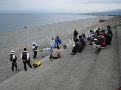 当日、マルキューさんのメンバーと6時に千本浜駐車場に待ち合わせ、会場の用意などをした後、続々と参加者が集結。今回の参加者は、近隣釣具店のスタッフさん達を中心に総勢約30名。