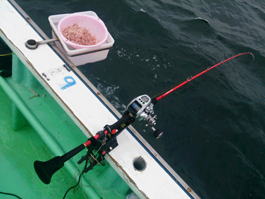 船長の指示に合わせてコマセを撒き仕掛けをタナに合わせていくと、始めに魚を掛けたのは隣の田中君。竿が大きく曲がり、魚とやり取