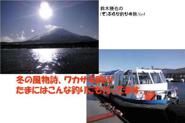 「冬の風物詩!」たまには、こんな釣りにも行っています。 「山中湖 ワカサギ釣り」 冬も終盤に差し掛かり2月4日は立春。立春とは暦の上で春の始まりを表す二十四節気の1つで「冬至と春分の中間に当たり、昼夜の長短を基準に季節を区分する場合は、この日から立夏の前日までが春となる。九州など暖かい地方では梅が咲き始め、暦の上ではこの日が寒さの頂点となる」そんな、立春の翌日2月5日に山中湖へワカサギ釣行に出掛けました。 山中湖は、私や岡田さんなどウキ工房の埼玉メンバーが伊豆釣行の際に通るルート「富士五湖有料道路」の横に位置し、埼玉から伊豆に行くまでの丁度中間点に位置します。早朝、4時に待ち合わせ6時すぎに山中湖へ到着。その山中湖周辺は、一面雪景色・・・しかも、朝晩の気温はー11℃、日中の最高気温もー1℃と+にはならない予報。しかも、山中湖「凍ってんじゃん・・・」しかし、時代は良くなったもので、そんな極寒の寒さでも「ポカポカぬくぬく」とワカサギ釣りが出来るのが「ドーム船」といわれる屋形船形式の室内釣り船。船中に穴が開いていてそこから仕掛けの上げ下ろしができるのですが、船内は暖房が完備され水洗トイレはもちろんレンジやポットも用意されている。しかも、今回の船には大画面薄型テレビにカラオケセット・・・と、いたせりつくせりの装備。どこかの渡船とは大違い・・・ 仕掛けを底付近まで降ろし、竿で誘いを掛けてワカサギを食わせるのですが、さすがに魚が小さいだけあってアタリも小さい。しかも、食い上げや横アタリなどアタリの種類も多く、水中の魚の動きを想像しながら判断するから難しい。そんな複雑なワカサギ釣りだから、その魅力に魅了される人も数が多いのでは?と思ってしまう。そんなことを考えながら釣りをしていると、当日初めてのアタリ!小さいながらも小刻みに竿を引き込んで綺麗な魚体で上がってきた第一号のワカサギちゃんをゲット! この時期のワカサギは、脂も乗り抱卵しているので食べても美味! |