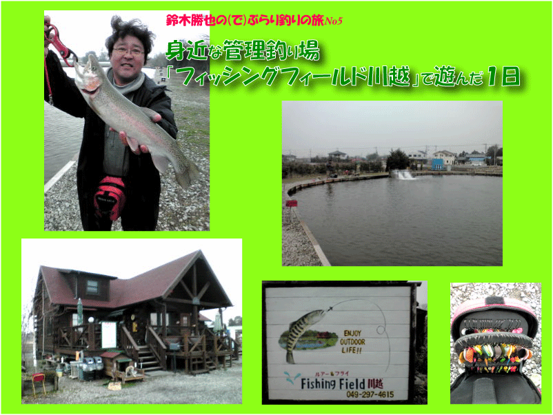 今回は・・・家族連れやカップルにもオススメ?管理釣り場の「トラウト(ニジマス)」です!・・・3月を迎えた1日の早朝、最近、私の中で「冬のマイブーム」となっている管理釣り場のニジマス釣りに行ってきました。しかも、場所は?というと、地元埼玉の川越にある「フィッシングフィールド川越」という管理釣り場。ちなみにここは、無料でバーベキューができる場所も貸していただけるため、午前中にトラウトフィッシング&午後バーベキューという事もできるので、人気の管理釣り場となっています。ここは、早朝7:00からのオープンなので、その時間に合わせて行こうと思っていたのですが、平日と言うこともあり、朝の道は大渋滞・・・そんな訳で、現地に到着したのは8:00前。当日の天気は曇、北風がそよそよ吹き肌寒く、防寒着が必要なコンディション。早速、駐車場にて準備をし、受付となっているログハウスへ。受付で料金を支払うと、「寒いからカイロと暖かい飲み物を持っていきな」と親切なお言葉・・・(嬉)そのカイロと飲み物を持って、道を挟んだ反対側にある釣り場に向うと、平日にもかかわらず7〜8名ほどの釣り人が釣りを楽しんでいました。そのため、水車周りの空いているスペースに入り釣りをスタートしました。