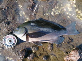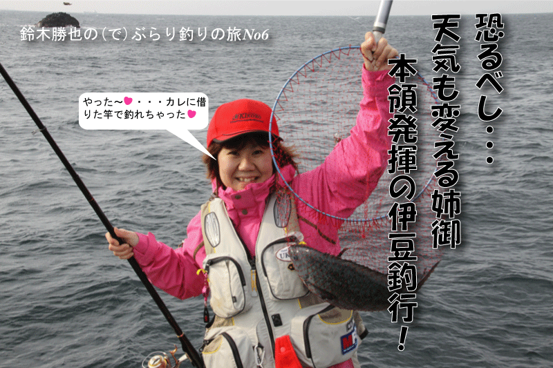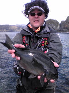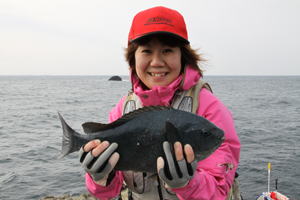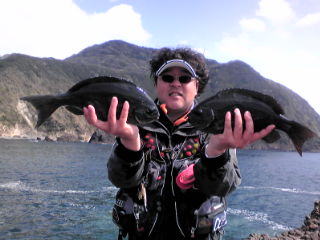 みなさんこんにちは。 だんだんと暖かいシーズンがやってきましたね。 関東・伊豆の河津では、早咲きで有名な「河津桜」が満開になり、地上よりも早く春が訪れるであろう海中のメジナちゃんに期待して、3月28日・29日と伊豆釣行に行ってきました。 ※ 初日の28日は、MFG東日本主催の伊豆大会に参加して「石廊崎」。29日は、最近、岡田さん&北村さんのお気に入りの場所「妻良」という予定。 今回28日の釣行メンバーは・・・ 孫も生まれ「おじいちゃん代表」の北村氏、それに「最近色気付いてきた姉御」こと久美ちゃん、それに、春の訪れを前に「まだ天然の防寒着を着たまま」の私・・・ それに、当日日帰り組みで「北村家の婿」こと田中達也(以下・達)&「愛媛から一人放浪の旅中」の鈴木さんとも合流。 また、長野からは黄門様ご一行「いつもニコニコ長野の黄門様」こと土屋氏・「お供のイケメン介さん」の斉藤氏も現地での合流。しかし、黄門様ご一行の釣り場は別で入間へ悪者退治に行くという・・・ 初日の28日は、MFG東日本主催の伊豆大会に参加。 南伊豆・大瀬に本部置き受付&検量を行うもので、毎年参加しているメジナシーズン初めの大会となる。 私達3名と達&鈴木さんは、受付を済ませた後に目的地の石廊崎へ向った。北村親子に久美ちゃんは「岡の丸島」へ、W鈴木チームは「赤島」へ分かれて釣りを開始・・・ 赤島へ渡った私達「チームW鈴木」は、兄・鈴木が数枚のメジナをキャッチするものの、強風&低水温で攻めきれず、根性も情熱も無くなり早上がり宣言をして「玉砕!」 そんな中、岡の丸島に渡った北村親子に「悲劇!」が・・・ 開始早々、磯デビューしてから初めて使う「外ガイド竿」を手にした久美ちゃんがやってくれました! 予想外の展開?久美ちゃんに44.5cmの口太メジナがヒット! いつものようにタモも用意せず釣りを始めていたので、上がってきたメジナのサイズを見た達があたふたとタモ入れレスキュー、そして、タモに納まったメジナを見ておじいちゃん呆然・・・無言に・・・ そのまま、終了時間を迎えた私達は港で着替えた後、検量所に向う車中で「これじゃ、明日は雪だな」と冗談交じりで会話を弾ませていたのだが・・・(これが、現実になるとは・・・) 大会検量に魚を出した久美ちゃんは、大型魚に0.5cm足りなかったものの「特別賞」のビールを貰い更に大興奮! 黄門様ご一行も、今回は悪者に逃げられたらしく、黄門様の土屋氏からは「是非、久美ちゃんを黄門様ご一行に招きいれ、悪者退治に協力して欲しい」と打診を受けた(笑) 庄内の秋野氏に続き北村親子をもまとめて撃破した久美ちゃん・・・この姉御、恐るべし・・・ ※石廊崎・宮島丸のブログに久美ちゃんの勇姿が載っていますので、皆様、ご覧下さい! 前日、玉砕した私と北村氏は2日目の妻良に勝負を賭けました! 前夜、外浦の「ちどり」に宿泊し、早朝4時に宿を出て5時に妻良港へ到着。 船長に挨拶を済ませた後、荷物を用意し5:30に港を出船しました。 妻良港は、ワンドの奥に港がありワンドの入り口に2本の離岸堤があるため、多少の西風なら湾内で竿が出せる地形となっています。また、ワンドの外にも多くの磯が点在し、最近、岡田さんや北村さんのお気に入りの場所となっているのだ。 当日の水温は13℃、北東風が強い状況でしたが船長が私達3名を降ろしてくれたのは、妻良の中でも沖に位置する一級磯の「平島」。 早速、三人とも釣る気マンマンモードでコマセを用意した。 私のコマセブレンドは、マルキュー・遠投ふかせTR・V9SPを各1袋にオキアミ6Kgを混ぜたもの。 最近、私はメジナ狙い時にこのブレンドが最も使いやすく信頼しています。 コマセを作り終えた北村氏「俺は、ここでいいや」と沖向きの釣座に構える。そして、久美ちゃんには船着け場で足場の良い場所を勧め、私は、沖向きのハエ根の上から竿を出すものの手前に大きなハエ根&大サラシで遠投して沖を狙うのも厳しい。 1時間ぐらい経ったであろうか?北村氏に待望のヒット!30cmぐらいのメジナをタモに入れようとしたが、途中で断念して抜き上げた。その後、同じ場所で北村氏がバラシ&高切れ・・・久美ちゃんに教えながら内側で竿を出した私も一匹メジナをキャッチ。その後、また沖向きへ戻る。その後から、サラシがきつくなり釣りにくくなったのか?今度は北村氏が内向きに移動。そして、バラシ・・・「ここは、釣座が少なくて釣れないから場所を変える」と船長に連絡。私も誘われたが、一級磯を空けるのも乗せてくれた船長に申し訳ないし、釣れそうな予感があったので平島に残った。 北村氏が移動後、内側で開始した1投目からメジナがヒット! その後もコンスタントに数枚のメジナが上がり久美ちゃんもメジナをキャッチ。久美ちゃんもメジナを釣り上げ私も一安心したのだが、その後、潮も止まり食いも渋くアタリの無い時間が続いた・・・ しかし、潮が流れ始めたと同時に軽い仕掛けで深い棚を狙っていく私に