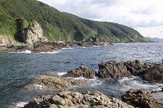 そして私と・長谷川・工藤両氏が赤岩の磯へ。ここの沖向いは、2段の階段状のドン深になっており、水深20m以上はあるのではないかとの説明。潮
