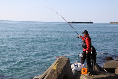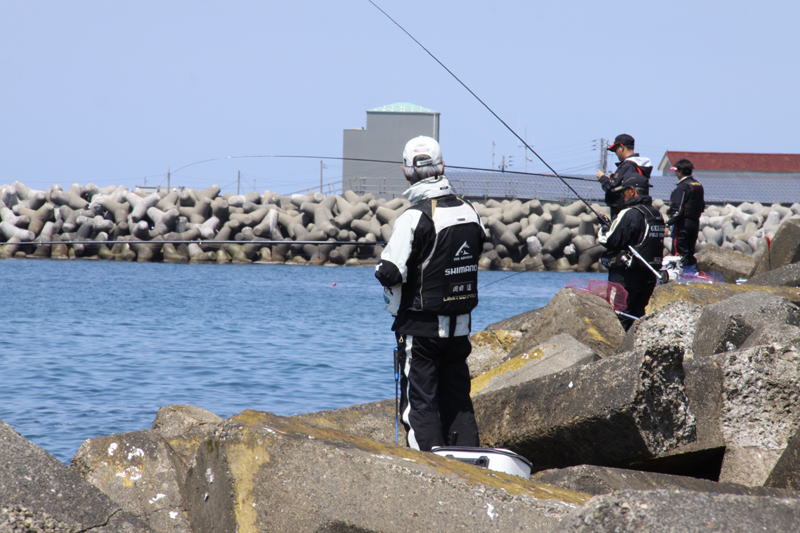現地に着くと若干ウネリがあり時々磯を波が上がっているため場所を変更し、筒石の「波消しブロック(三角テトラ堤防)」に。早速、ゴムボートを用意し堤防に渡り各自それぞれの場所に入り竿を出した。