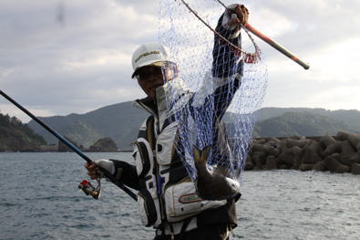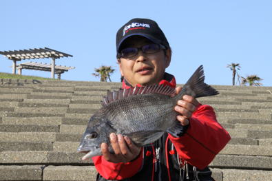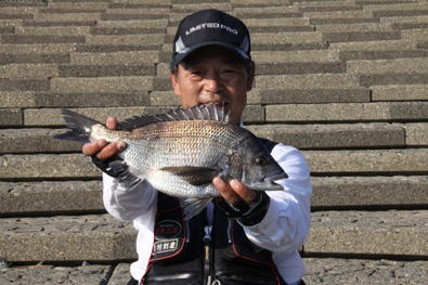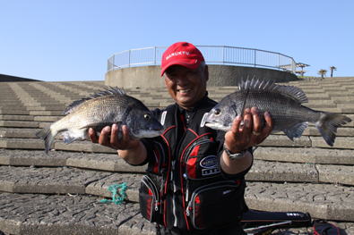 達也君の脇に入れてもらいウキをフィールドプラスSS「0」に変更し、タナ2.5ヒロで「隠れ根」際を張っているとウキがジワーッと入って道糸を張ると快い魚信、やっと37p程のクロダイをゲット。同じように釣っていると数投後に40p程を釣った。岡田氏も休んでいた達也君の竿を使い40p程をゲット。
