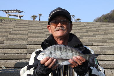 水温が10°〜11℃と例年より比較的低く、ノッコミが10日以上遅れている様子。しかし、齋藤君・田中君とヒットし、見た目37p前後を釣り上げその後、内向きで竿を出していた熊谷氏が沖向きに移動し35p程をゲットした。そして「ノッコミのクロダイは10時からと。」寝坊してきた土屋氏も到着し、齋藤君の脇で竿を出しクロダイを釣り上げたが、自分と岡田氏の竿が曲がらない。2〜3年前にこの場所に来た時、釣れている場所の前に「隠れ根」があり、以前は根掛りして釣りづらい場所であったはずだが・・・・。やがて潮が変わり又、南西の風が吹いてきたので、釣り座を移動。