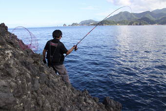 達也君は、沖に向かって左側に、私は右側に釣座を決め早速開始。潮は右側の湾を回って沖に出る引かれ潮。「コブ」は、松崎港に向かって、沖目に大きな岩礁があり、ポイントは、足下と岩礁の間若しくは、岩礁の周辺で、メジナ・クロダイとマダイも期待される。