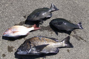 足元にコマセを撒くと、箱フグがチラホラ見える程度。達也君がコッパメジナを掛けるがサイズアップしない。暫く足元を攻めていると、フィールドマスターがもぞもぞと海中に消えていった。軽く張ると、グーンと強い引き、足元のエグレをかわし浮かせると形の良いクロダイ君。無事タモに収めると50p。ややスマートだが満足。その後、暫らくして達也君が、竿2本の深タナを攻めていたら、強い当りがあり浮かせると38p程のマダイ君・・・これには、達也君も大喜び。その後、メジナもヒットするがなかなかサイズアップせず、35p止まり。今度は、遠投し深タナ〔ウキをデルタ1・S(2B)に変更、ガン玉2Bとハリスにガン玉G5〕を攻めると、私にも33pのマダイがヒット、これでとりあえず赤(マダイ)青(メジナ)黒(クロダイ)と3色揃った。しかし、その後アイゴがヒットしはじめ苦戦。