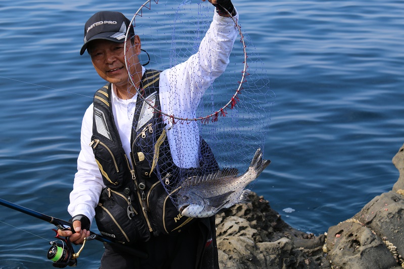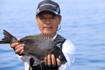 | 緩い潮の中で食ってきたのは43cmのクロダイ。専門に狙っても おもしろそうだ。 |