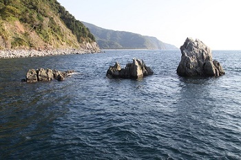 一番右の磯が今回の釣り場「二ノ島」。南向きに二人、北向きに 一人入れるが行き来はできない。 |