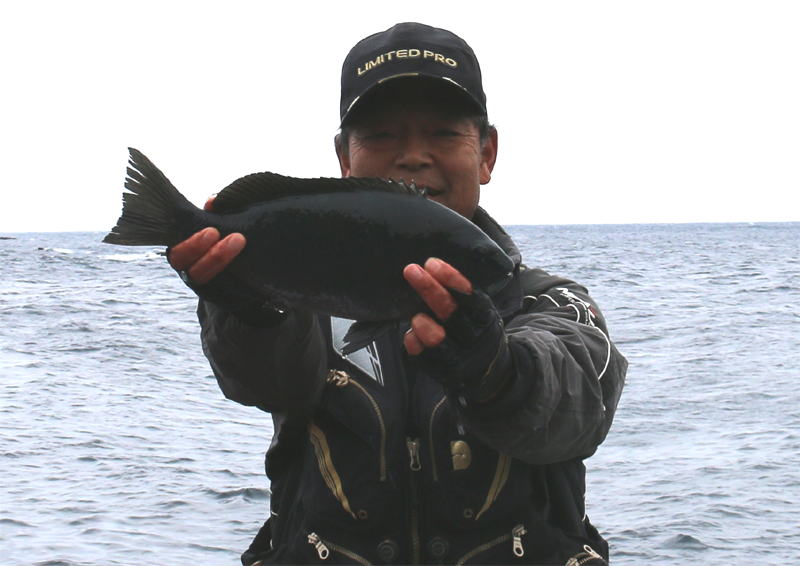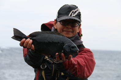 渡部氏も風に負けじと頑張っているようで同じようなサイズのメジナをヒットしている。上がり際に刺し餌が残りはじめたので、タナを2ヒロから3ヒロに深くしたら37pがヒットしたが納竿の時間。
